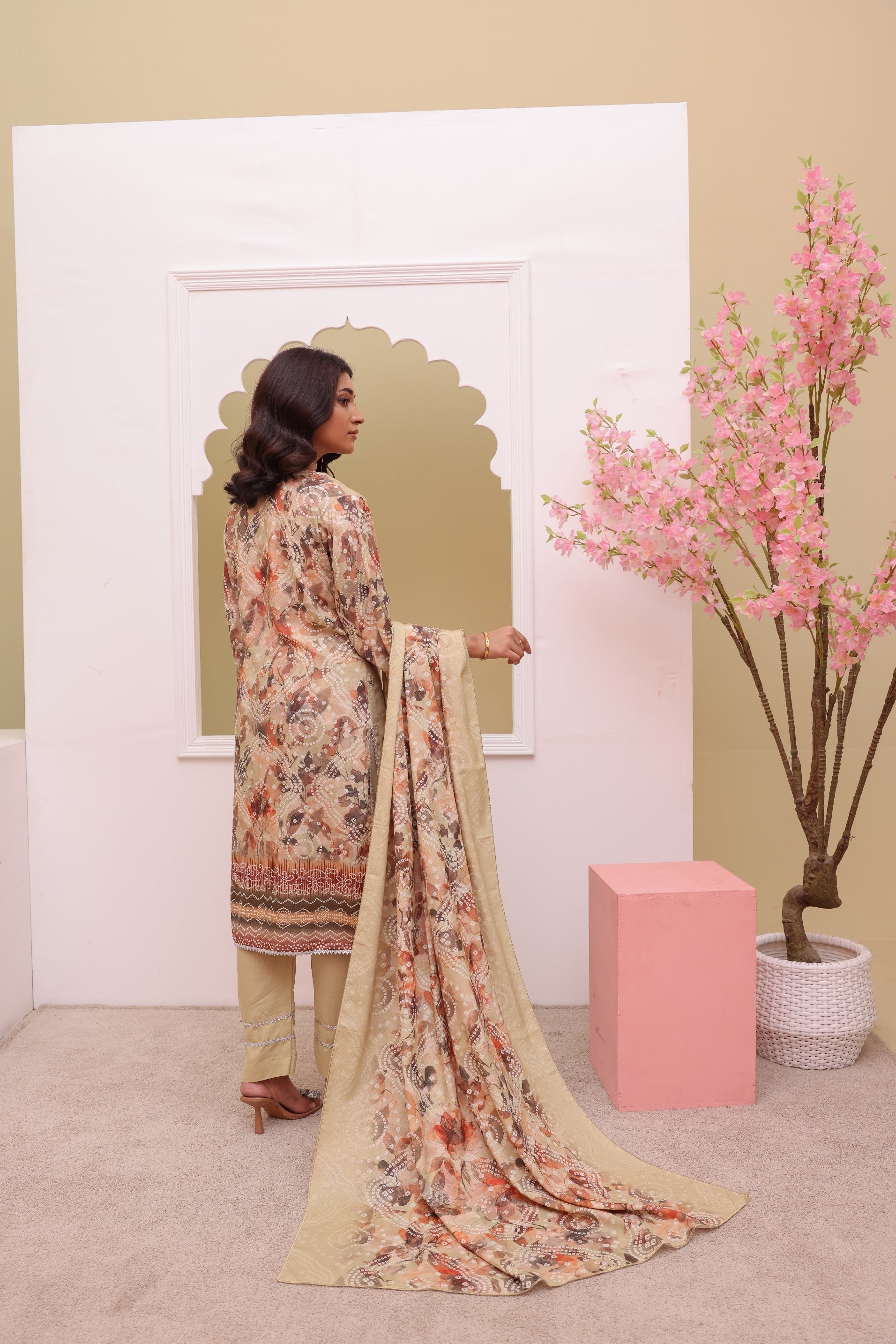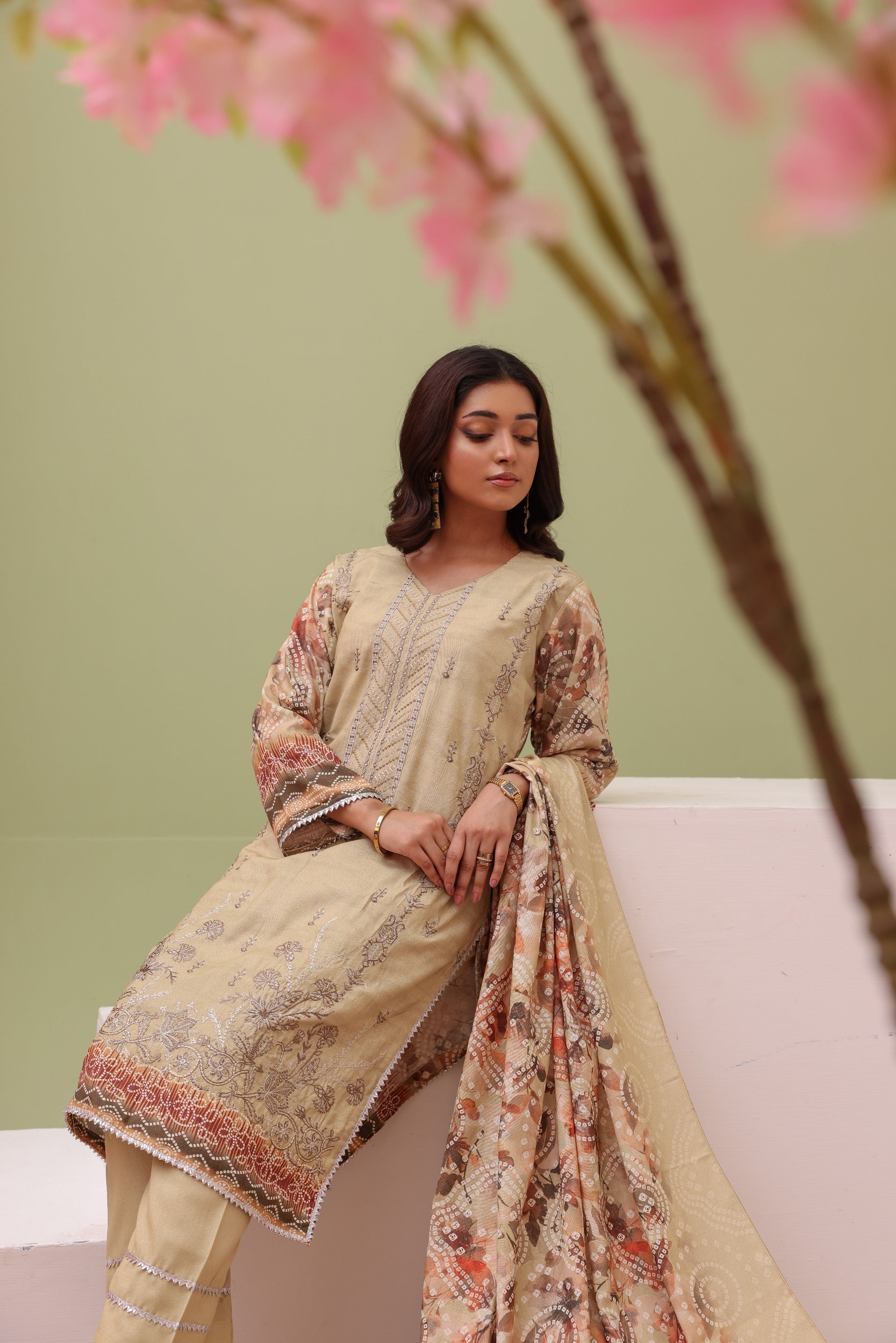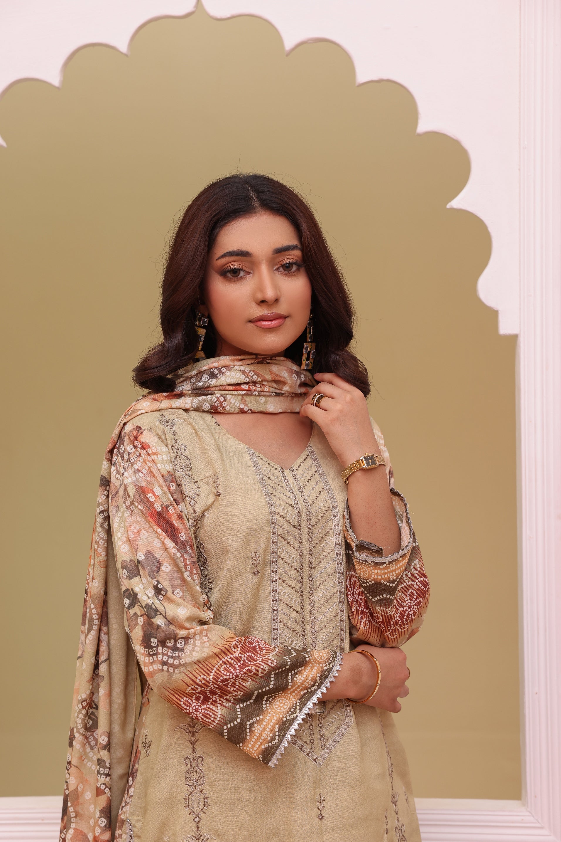 Luxury unstitched 3-piece suit featuring digital print embroidery on soft Karandi fabric for a chic and timeless style – ideal for festive gatherings and classy winter fashion