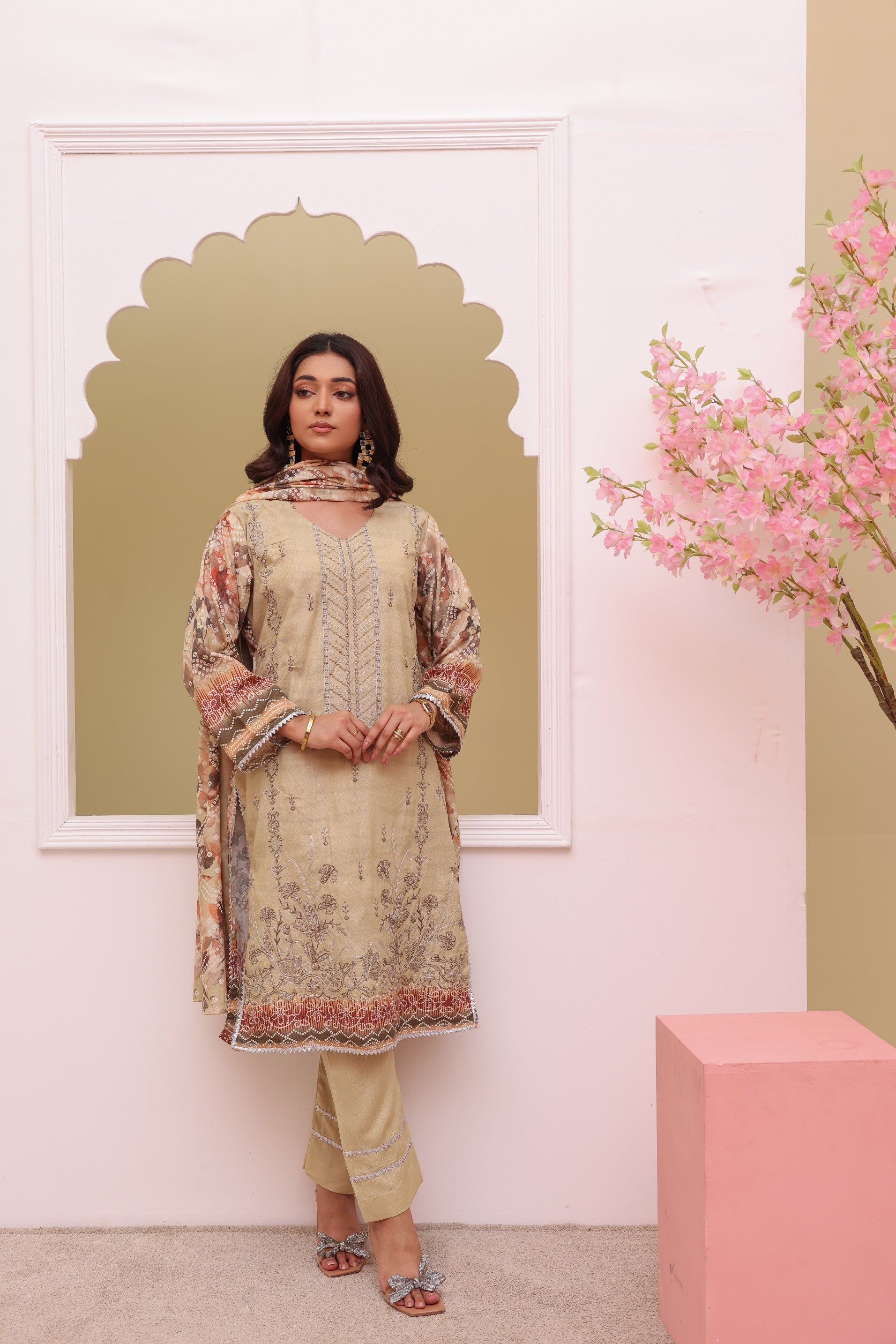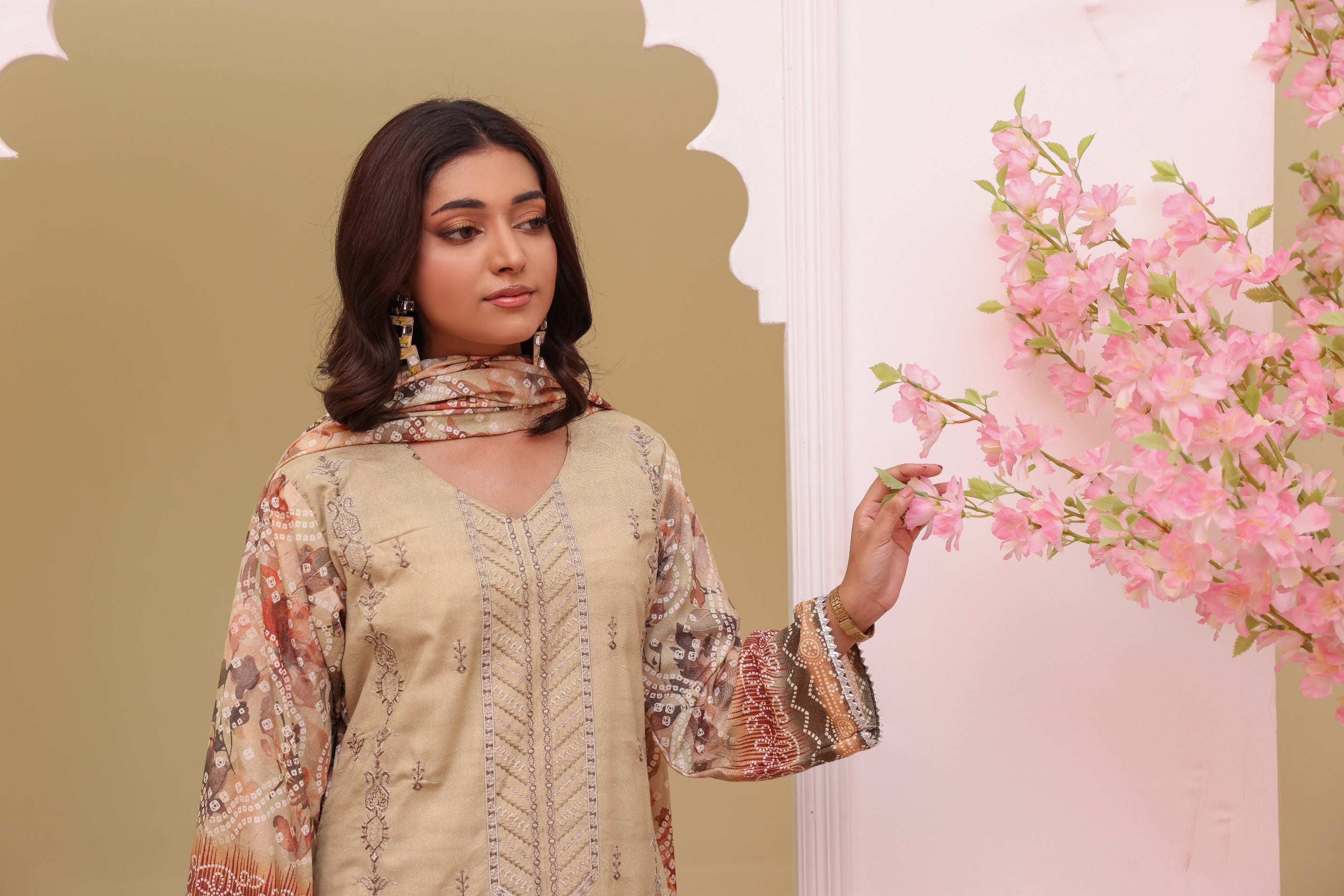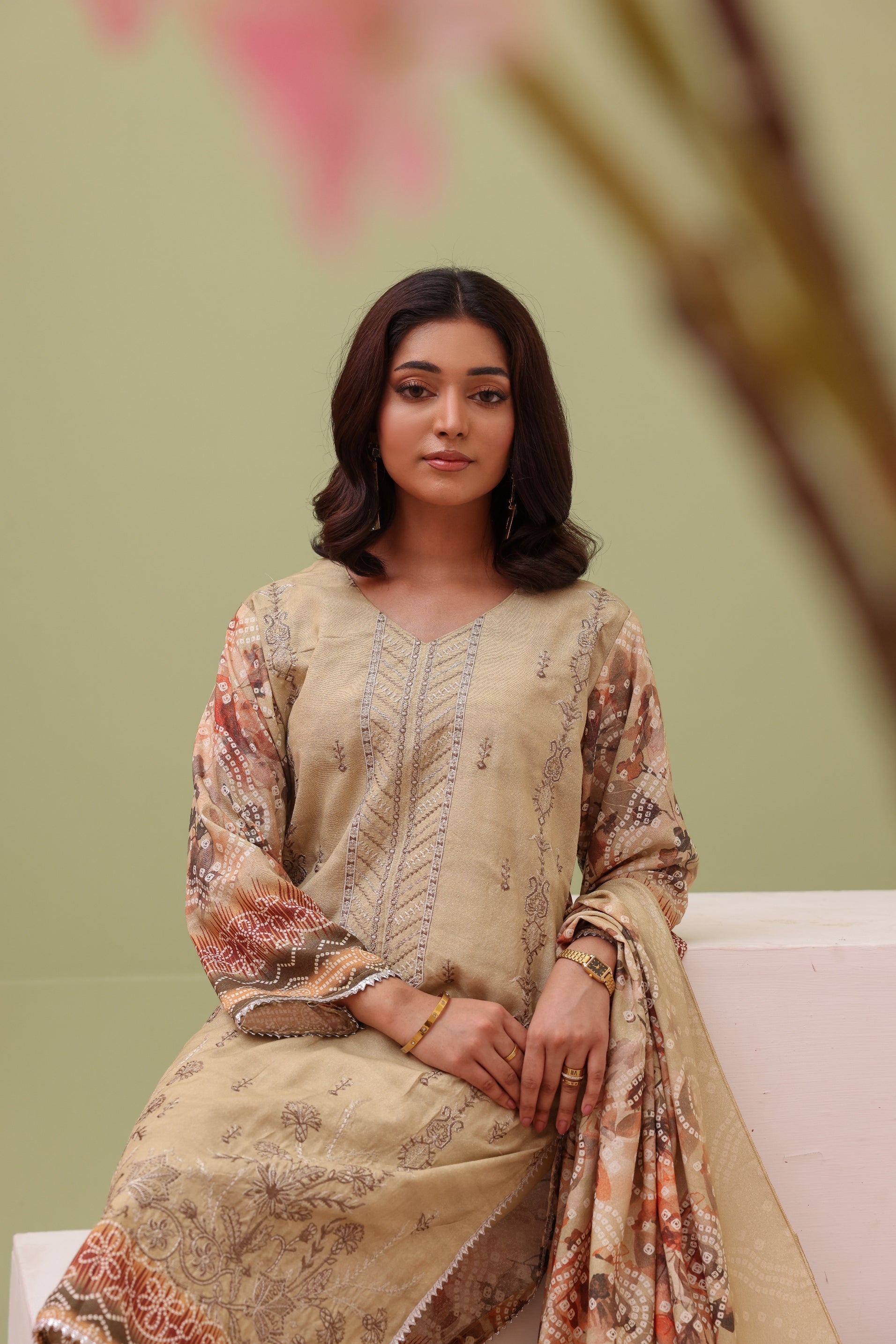 Luxury unstitched 3-piece suit featuring digital print embroidery on soft Karandi fabric for a chic and timeless style – ideal for festive gatherings and classy winter fashion