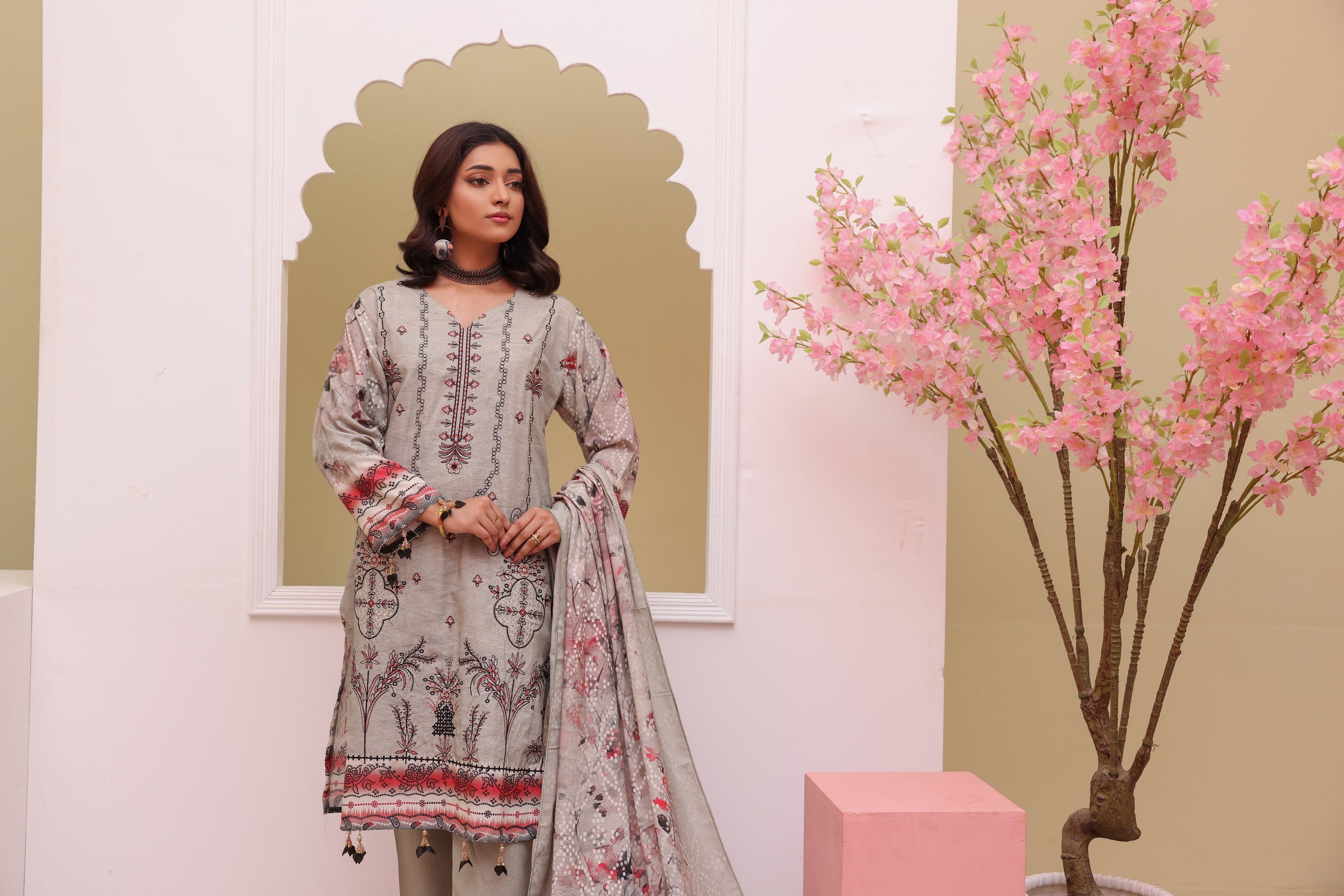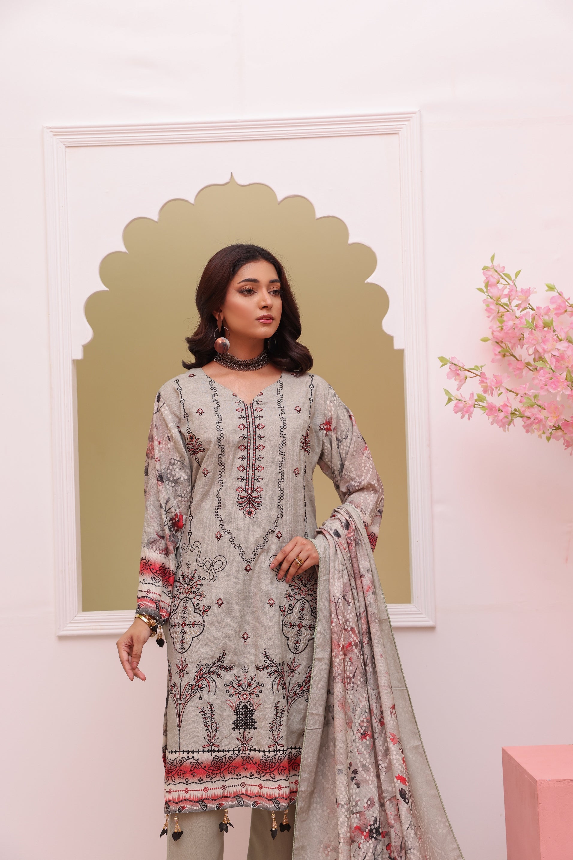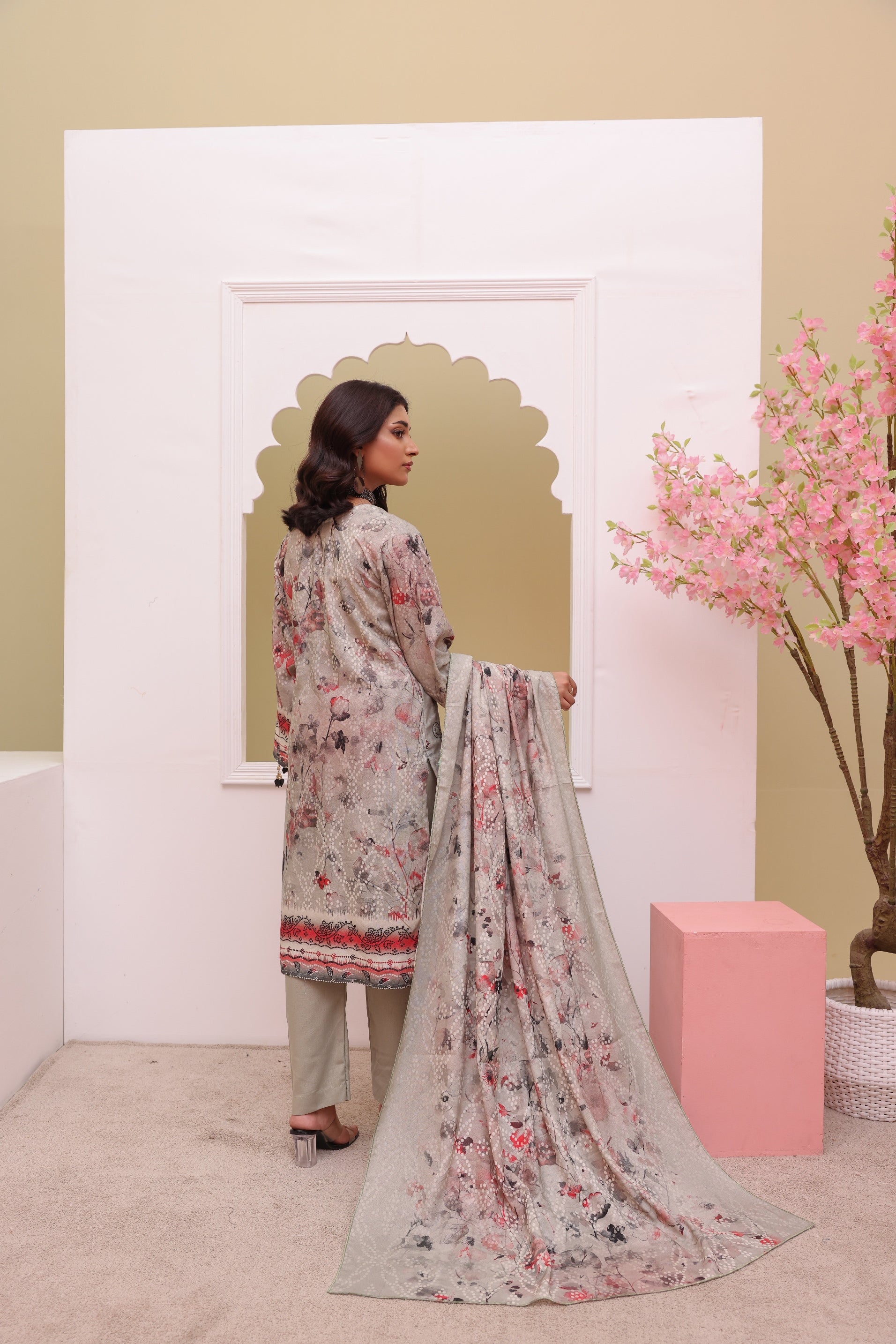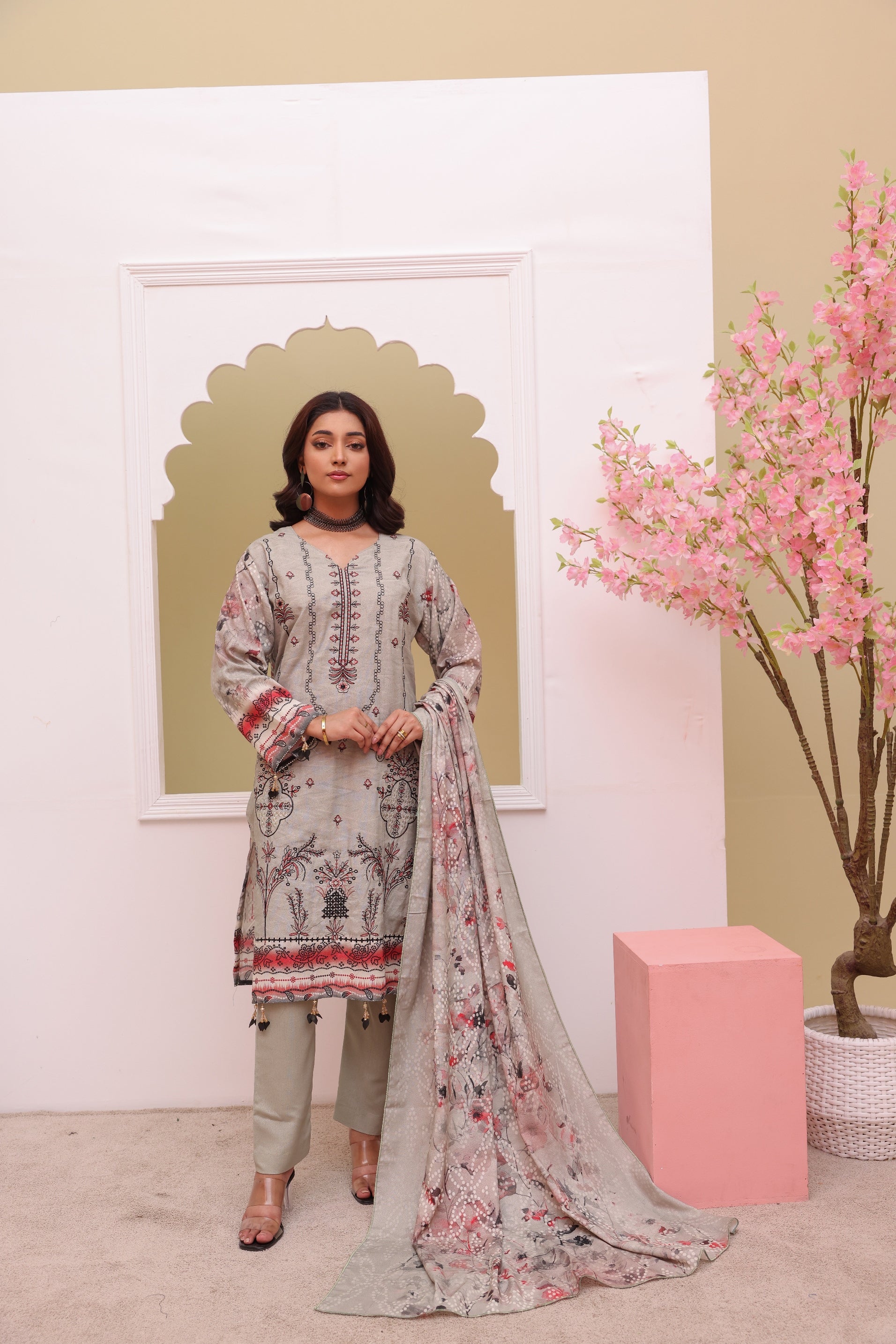 Luxury unstitched 3-piece suit featuring digital print embroidery on soft Karandi fabric for a chic and timeless style – ideal for festive gatherings and classy winter fashion