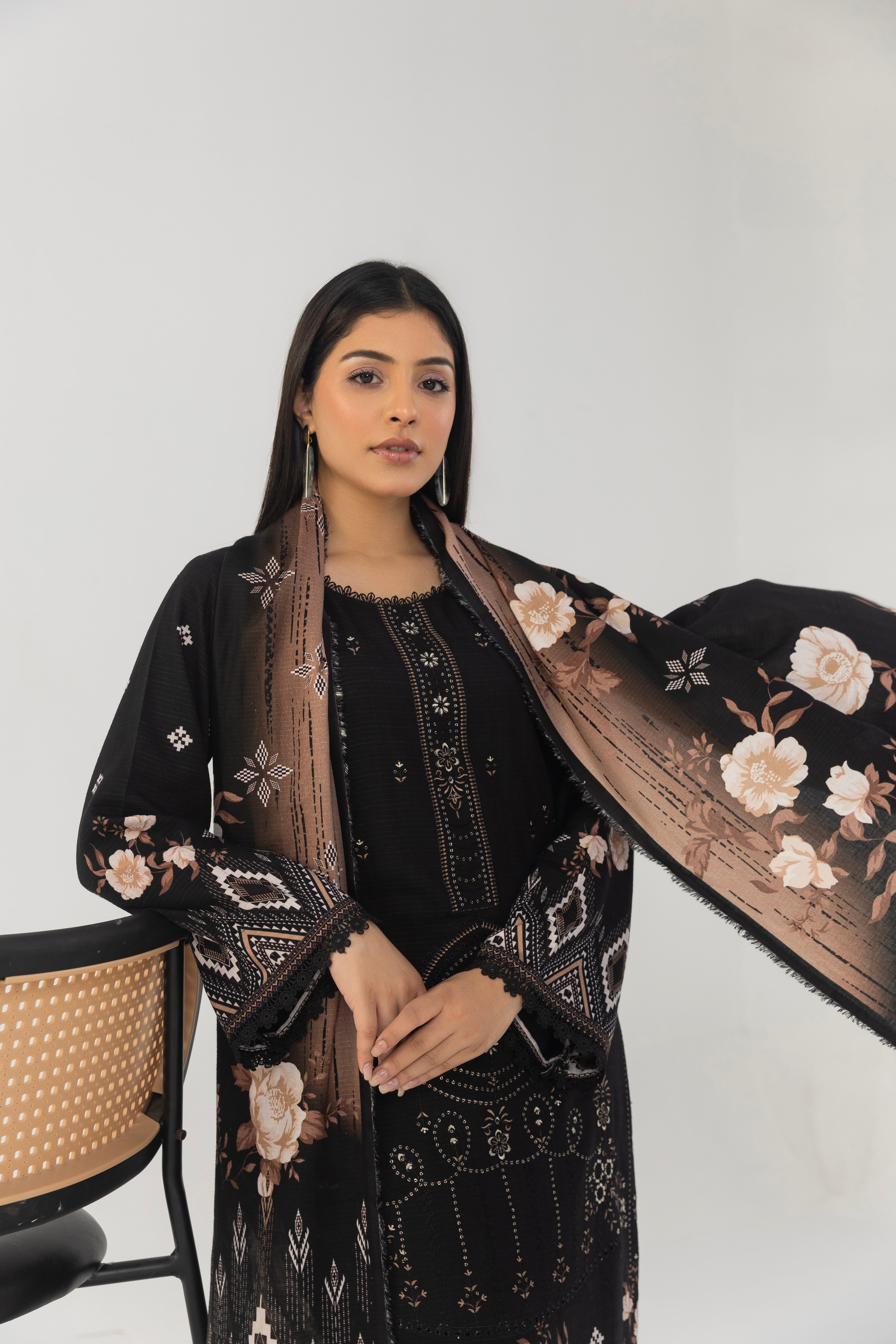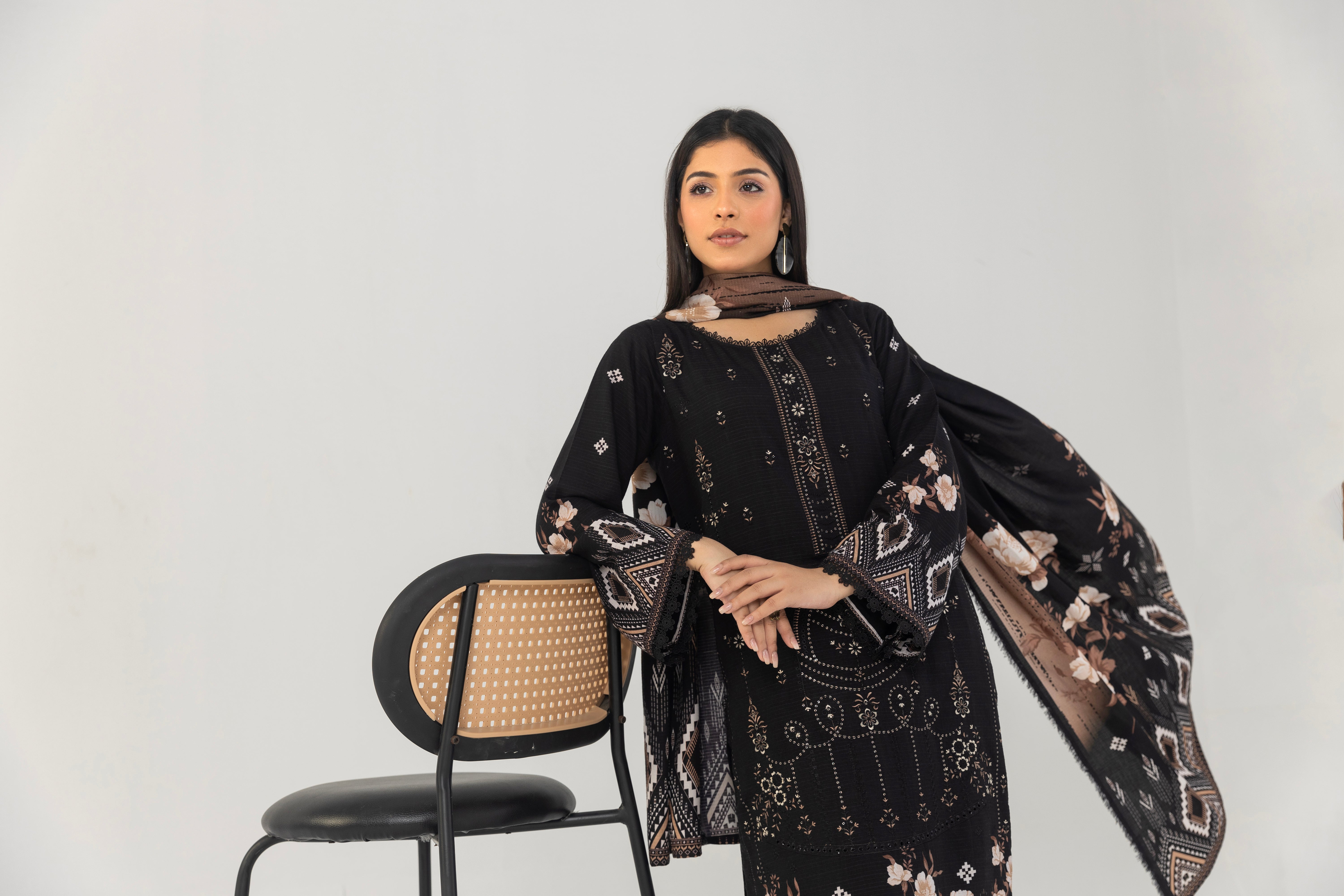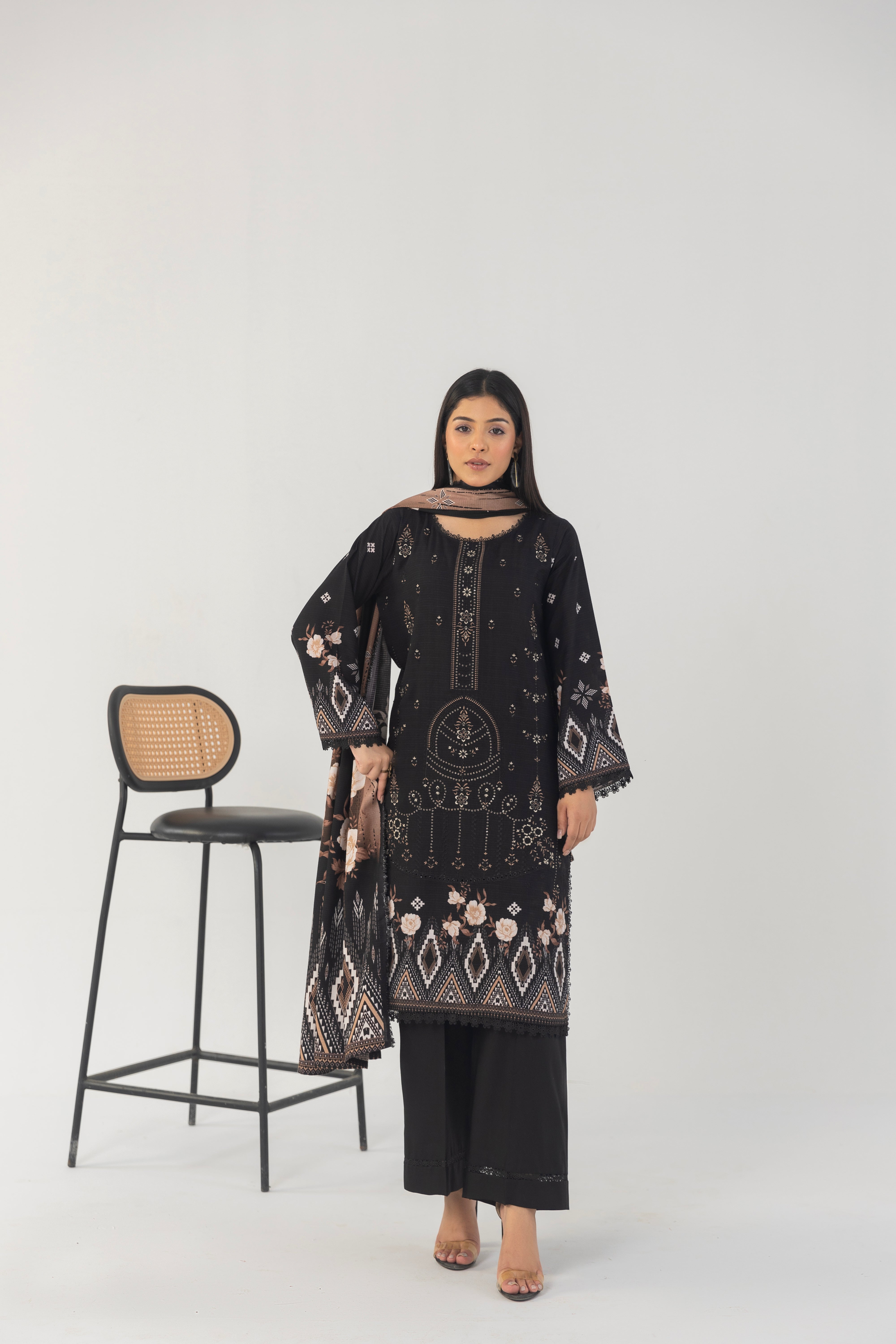 Redefine everyday elegance with this beautifully crafted unstitched 3-piece ensemble. Featuring a digital printed staple Bana Dora embroidered shirt, complemented by a matching printed dupatta and staple dyed trouser — perfect for a graceful and timeless look this season.