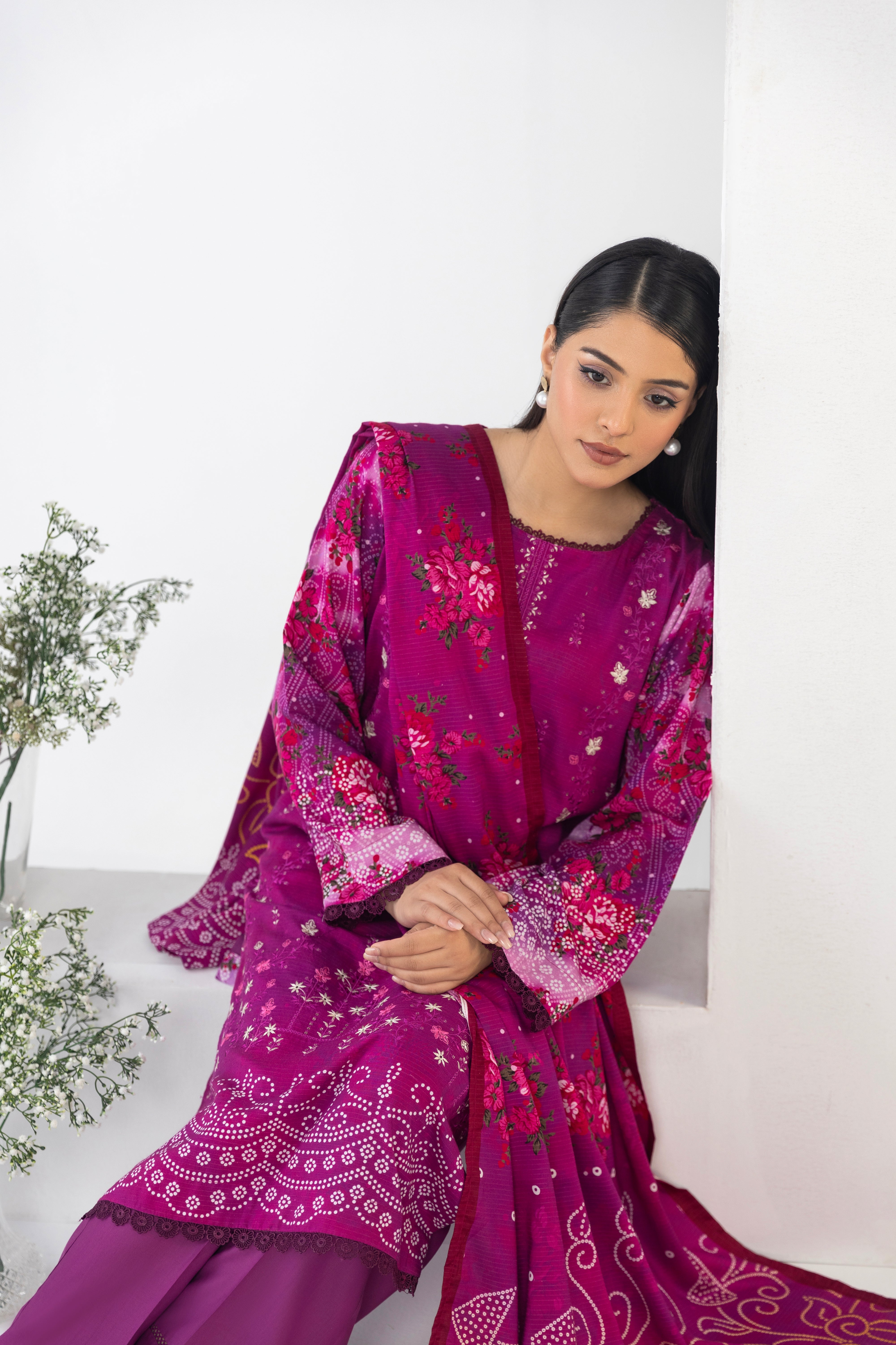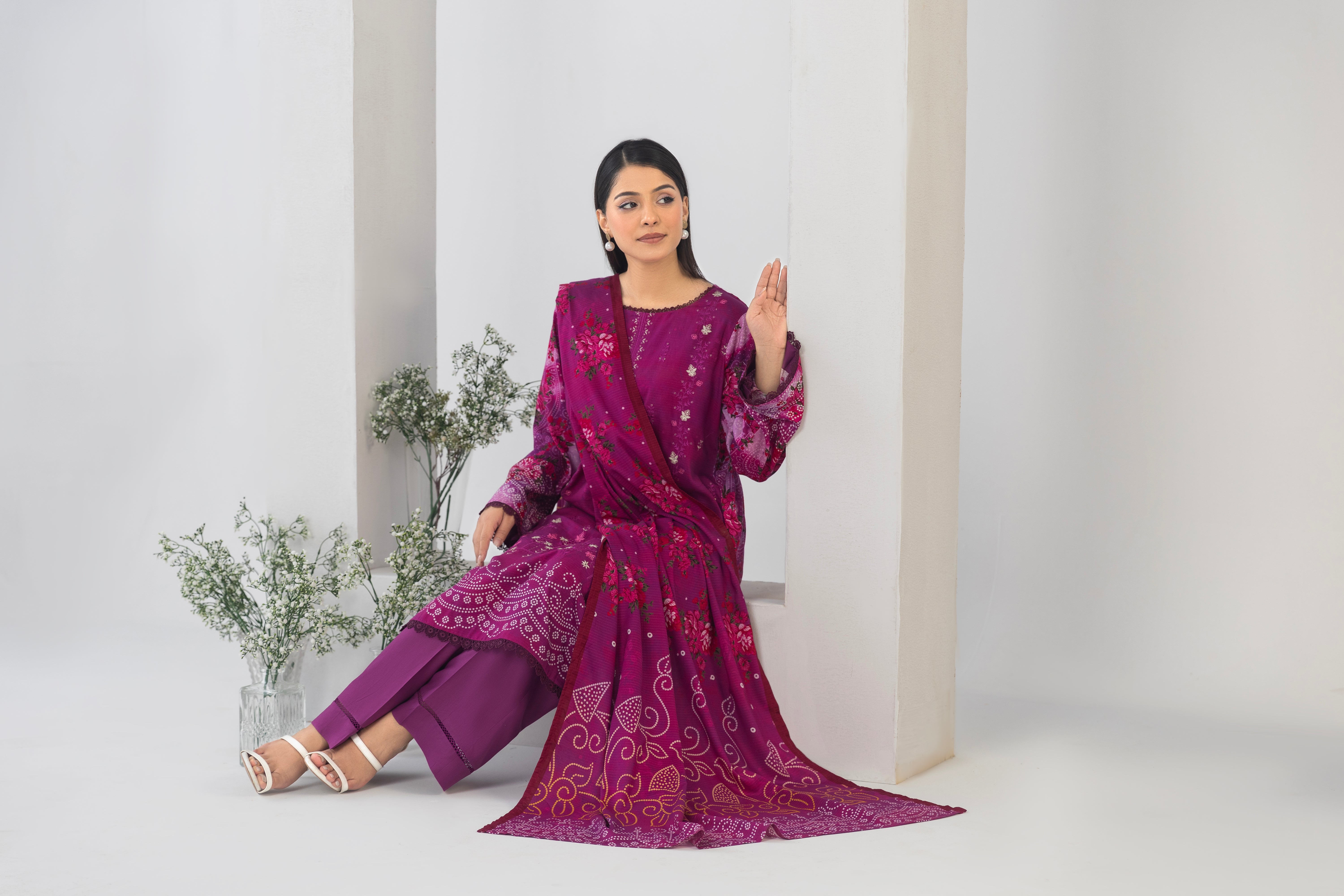 Redefine everyday elegance with this beautifully crafted unstitched 3-piece ensemble. Featuring a digital printed staple Bana Dora embroidered shirt, complemented by a matching printed dupatta and staple dyed trouser — perfect for a graceful and timeless look this season.