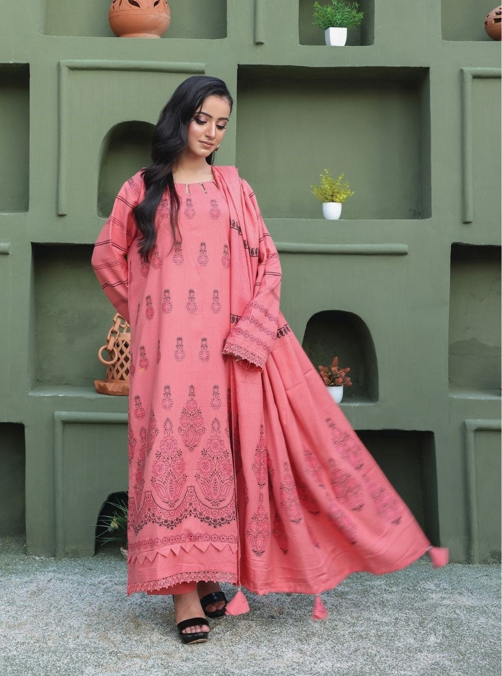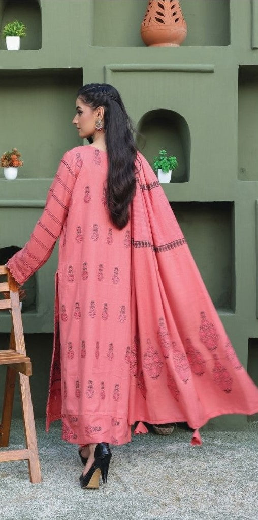Step into elegance with this stunning unstitched 3-piece ensemble, featuring rich crystal velvet Jacquard Dhanak embroidery. Paired with a luxurious matching shawal and plain dyed trouser, this timeless outfit is the epitome of winter sophistication .