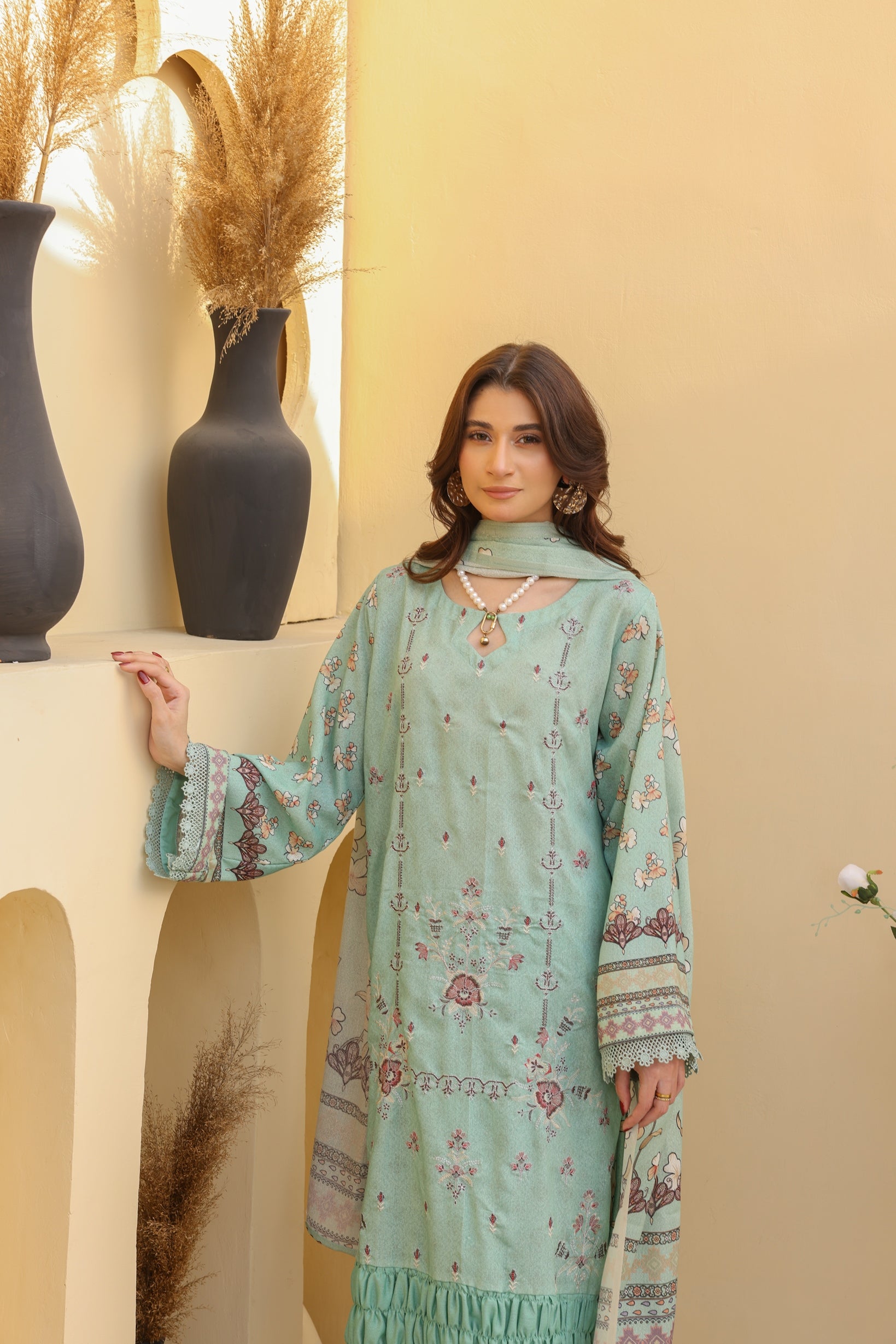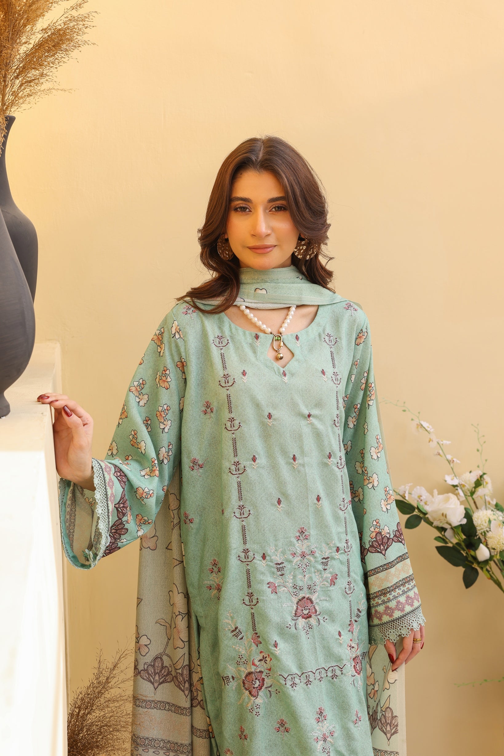 Digital Printed & neckline Embroidery Karandi Shirt