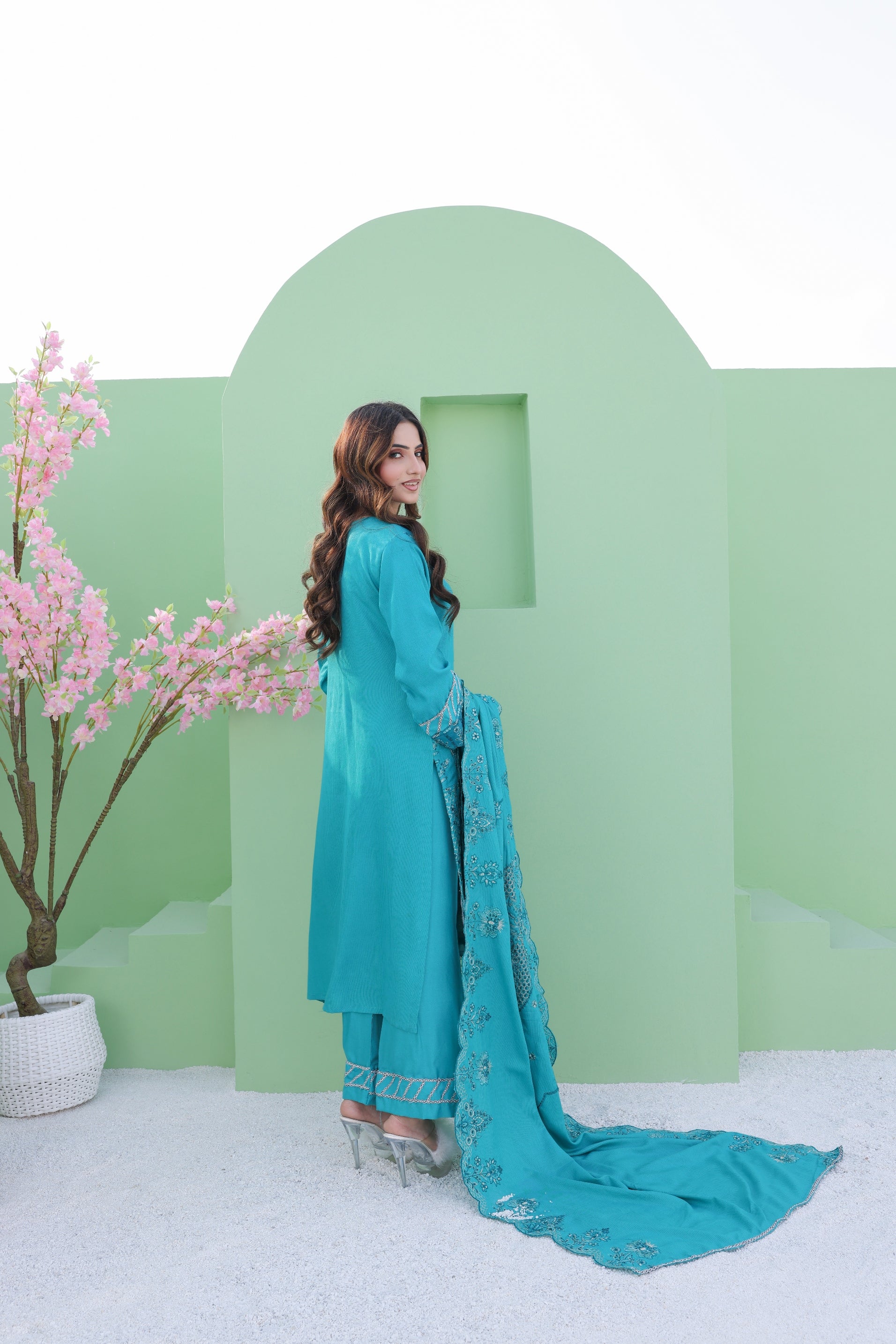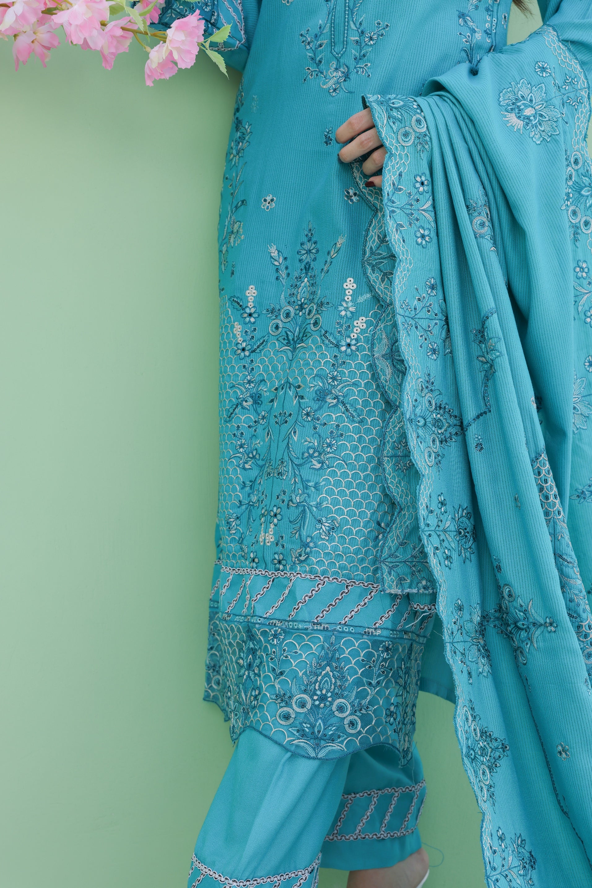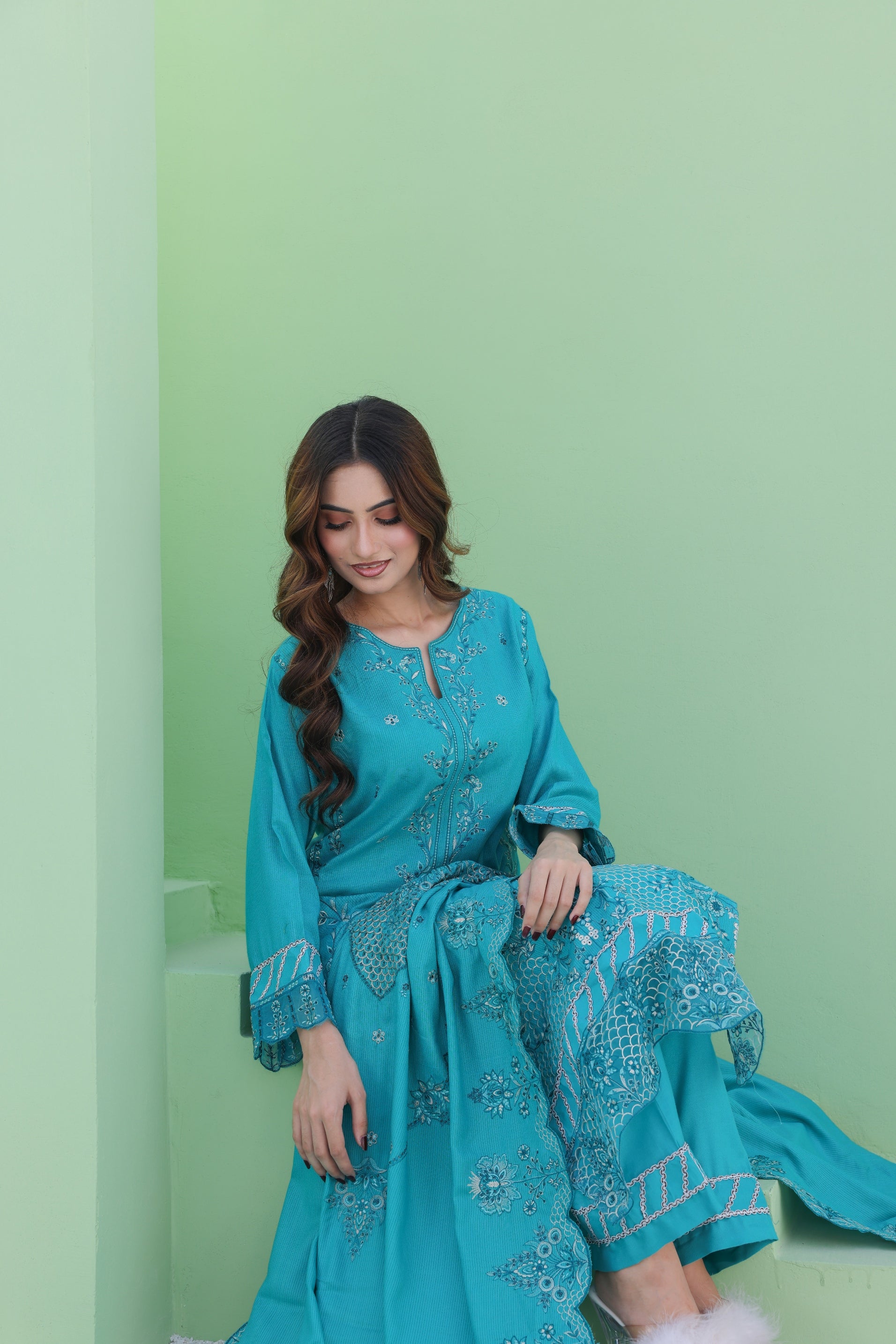 Step into elegance with this exquisite unstitched 3-piece ensemble, crafted from luxurious Danak Chamki fabric. Featuring intricate embroidery with organza patchwork, paired with a fully embroidered dupatta and matching trouser — a timeless expression of festive grace and sophistication.