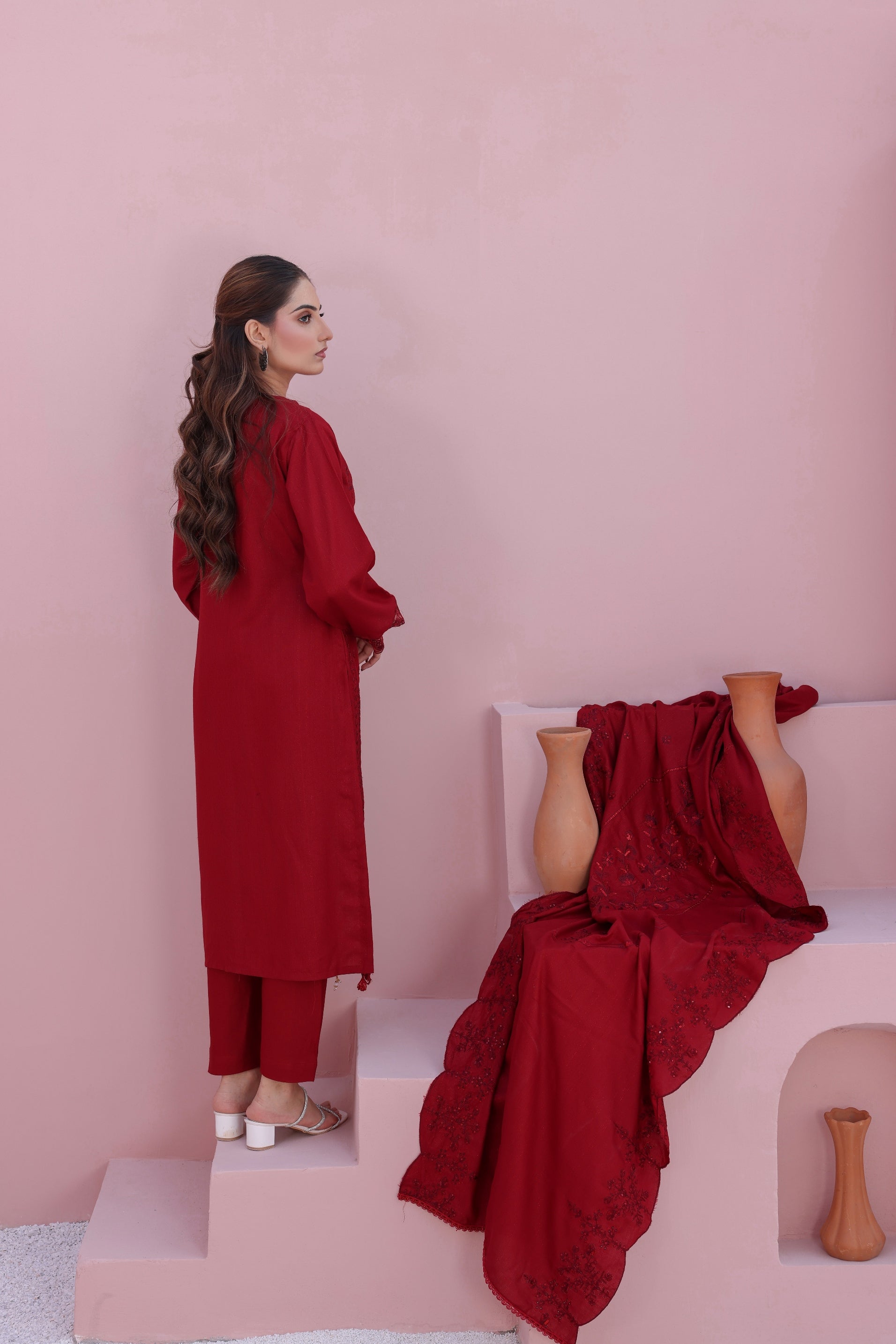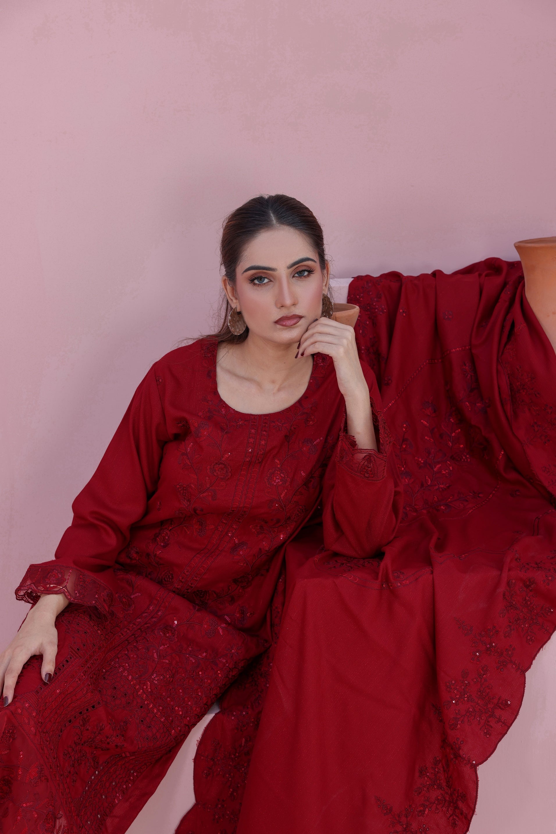 Step into elegance with this exquisite unstitched 3-piece ensemble, crafted from luxurious Danak Chamki fabric. Featuring intricate embroidery with organza patchwork, paired with a fully embroidered dupatta and matching trouser — a timeless expression of festive grace and sophistication.