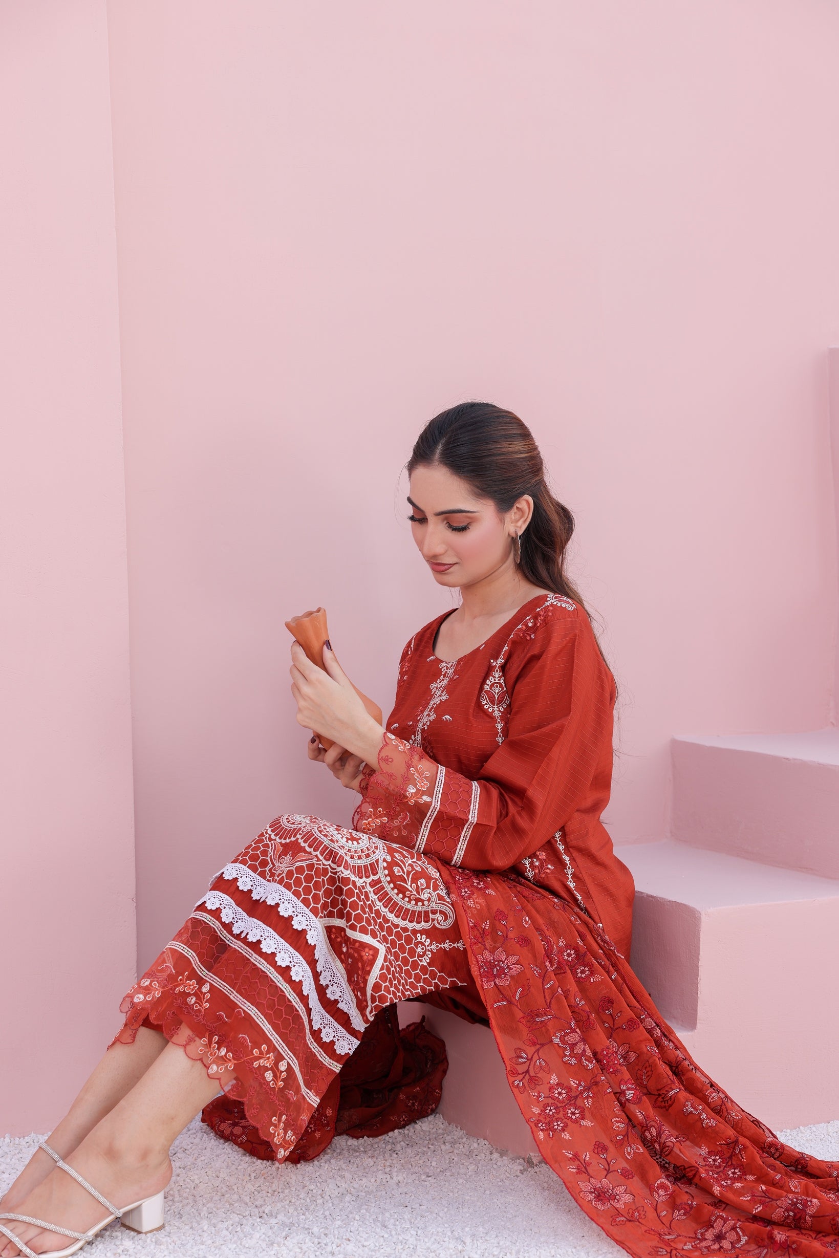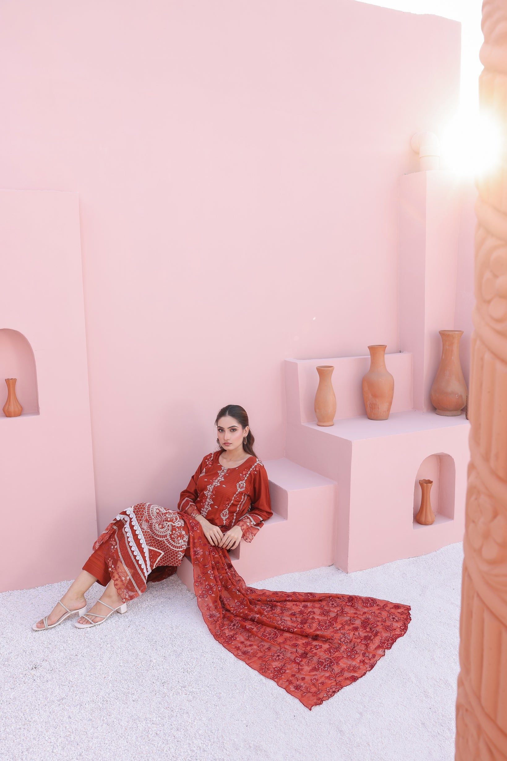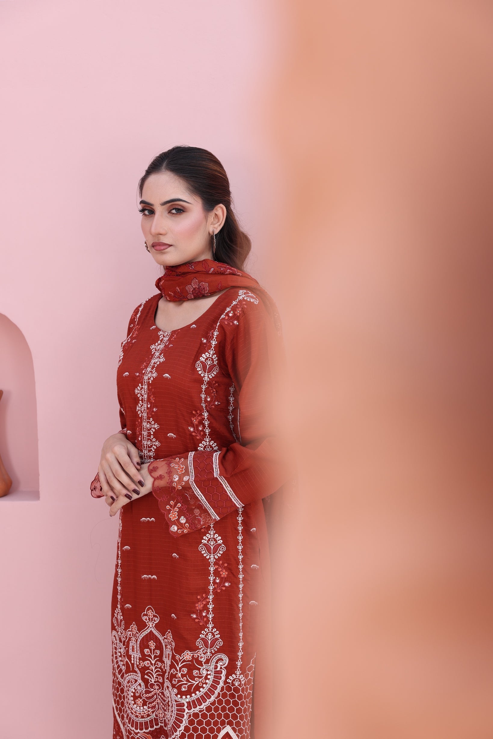 An epitome of refined grace — adorned with intricate embroidery on premium fancy viscose and paired with an ethereal braeeze bamber chiffon dupatta. Perfectly complemented by a dyed viscose trouser, this ensemble redefines modern luxury with timeless charm. ✨