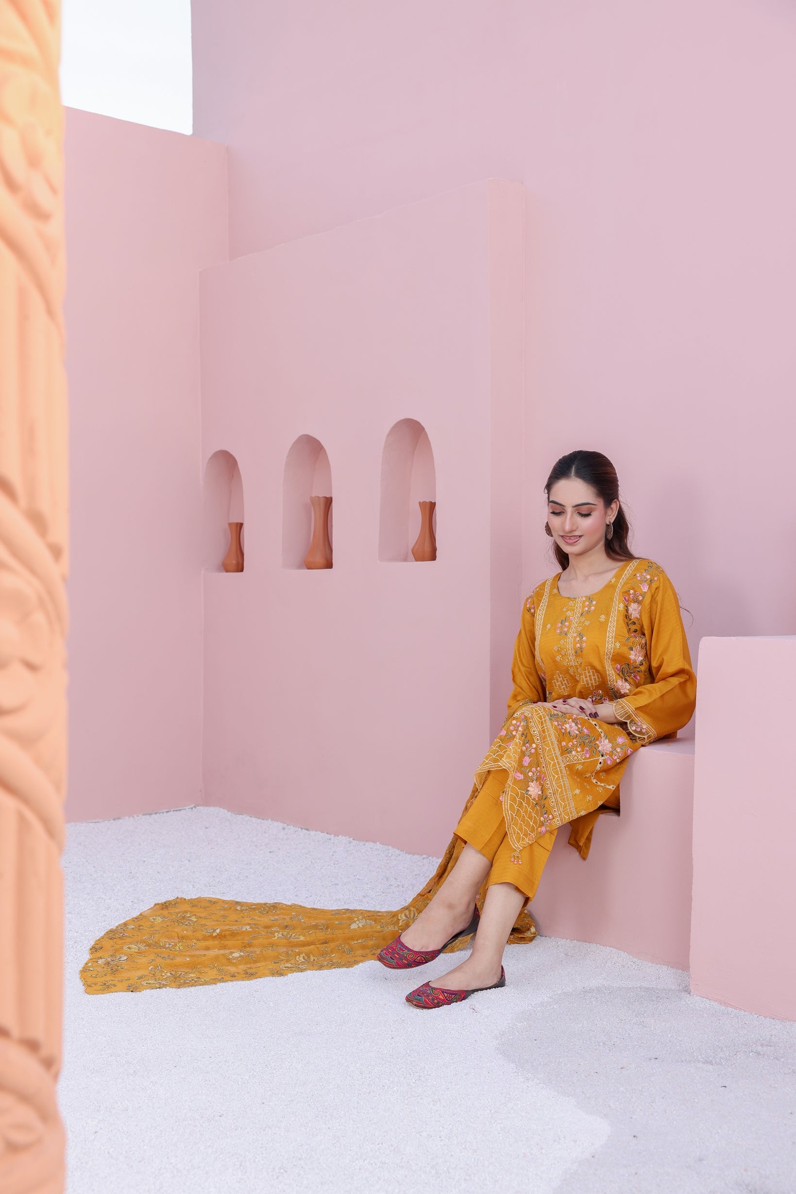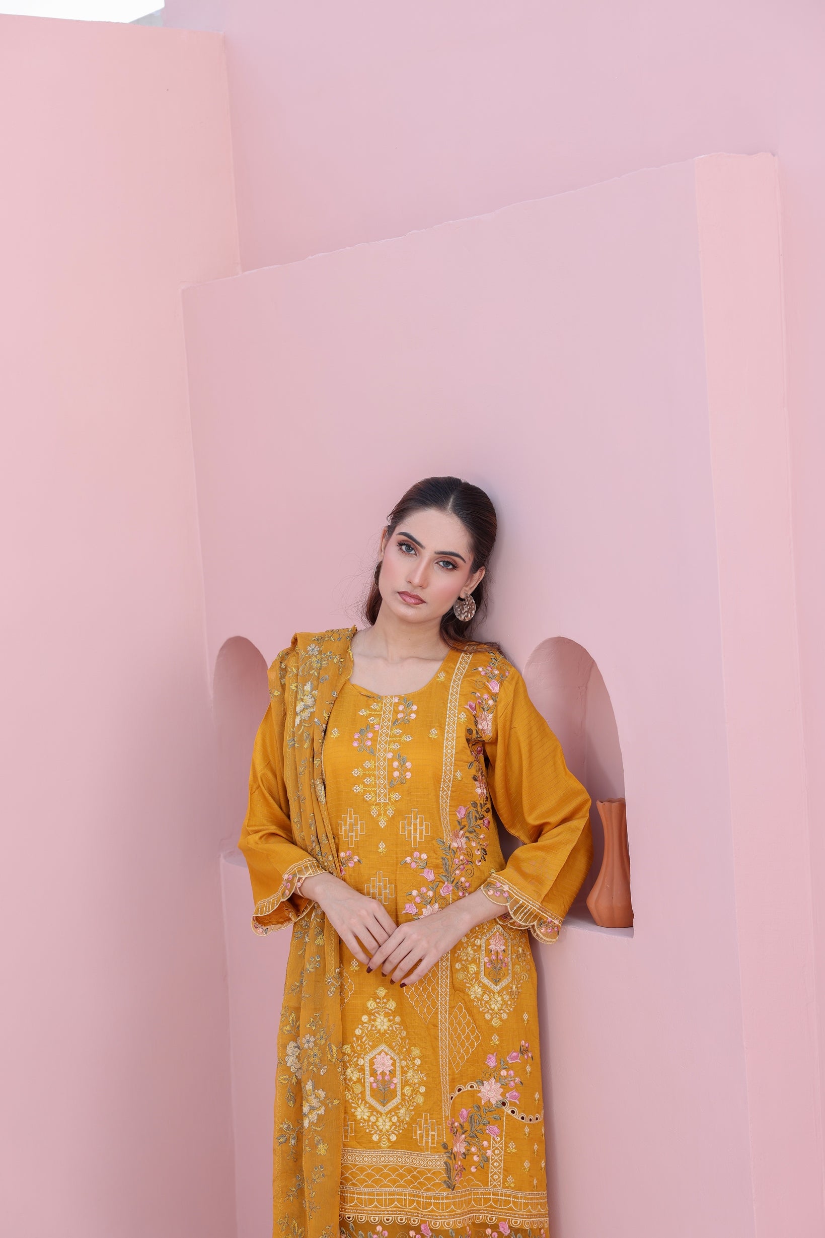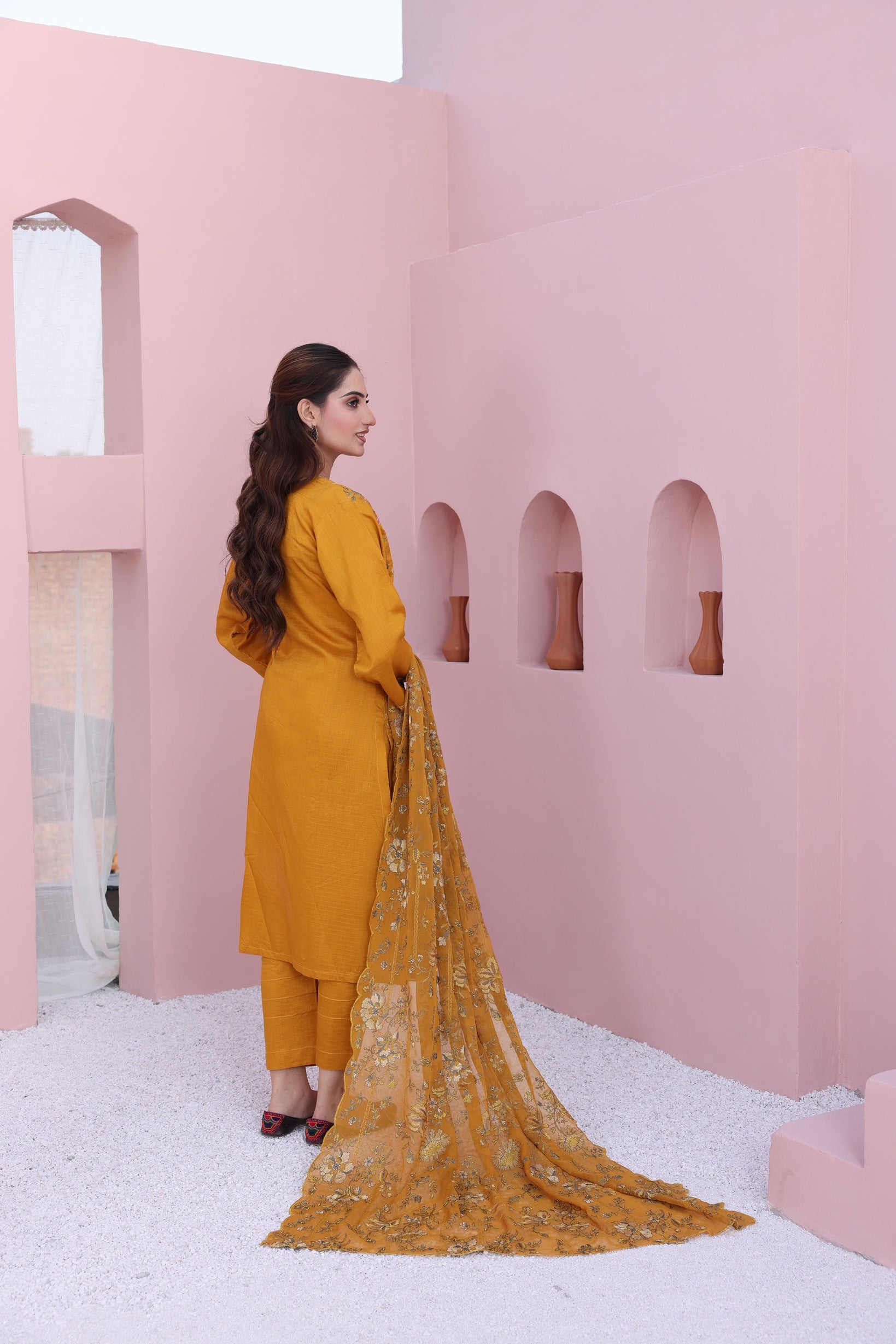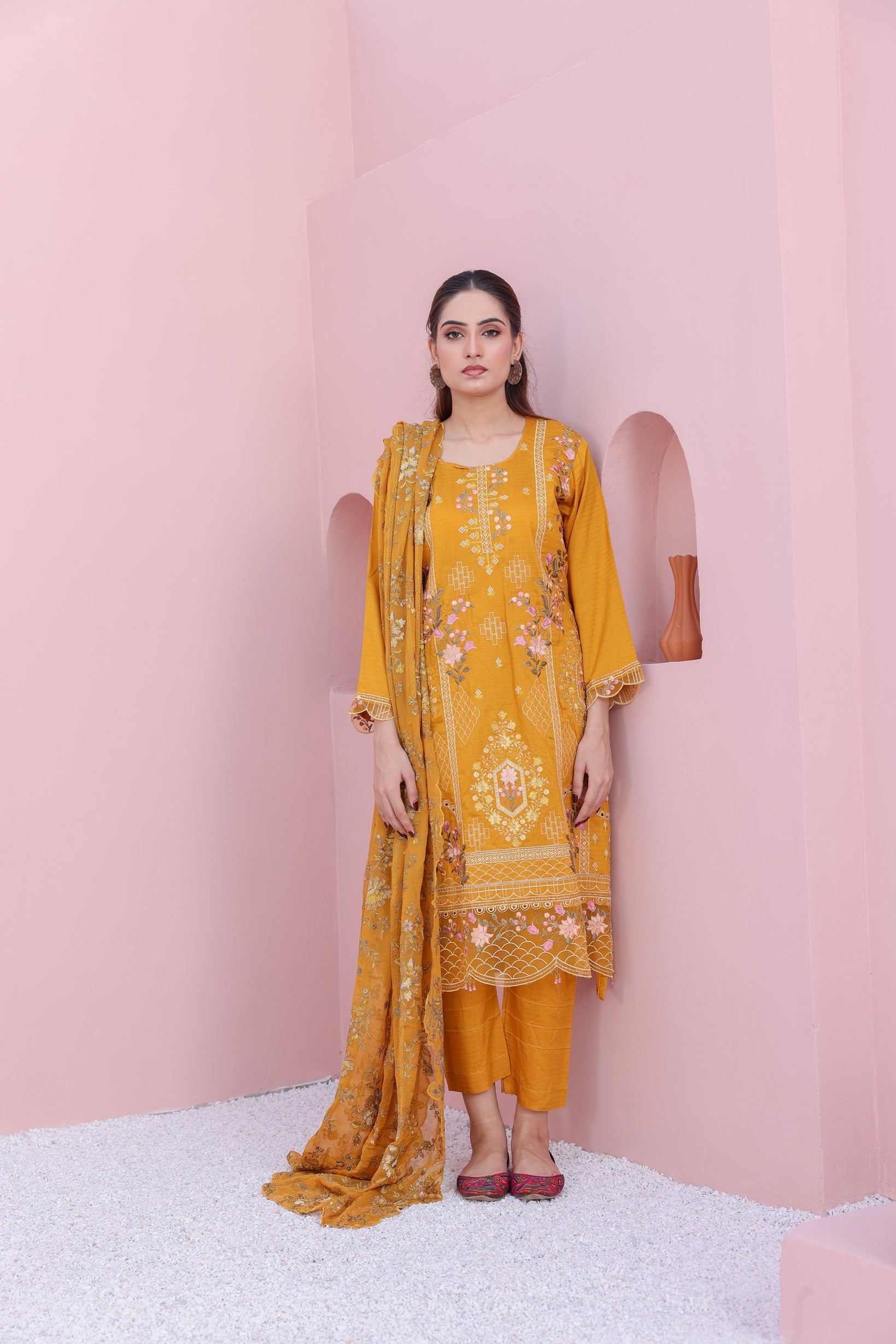An epitome of refined grace — adorned with intricate embroidery on premium fancy viscose and paired with an ethereal braeeze bamber chiffon dupatta. Perfectly complemented by a dyed viscose trouser, this ensemble redefines modern luxury with timeless charm. ✨