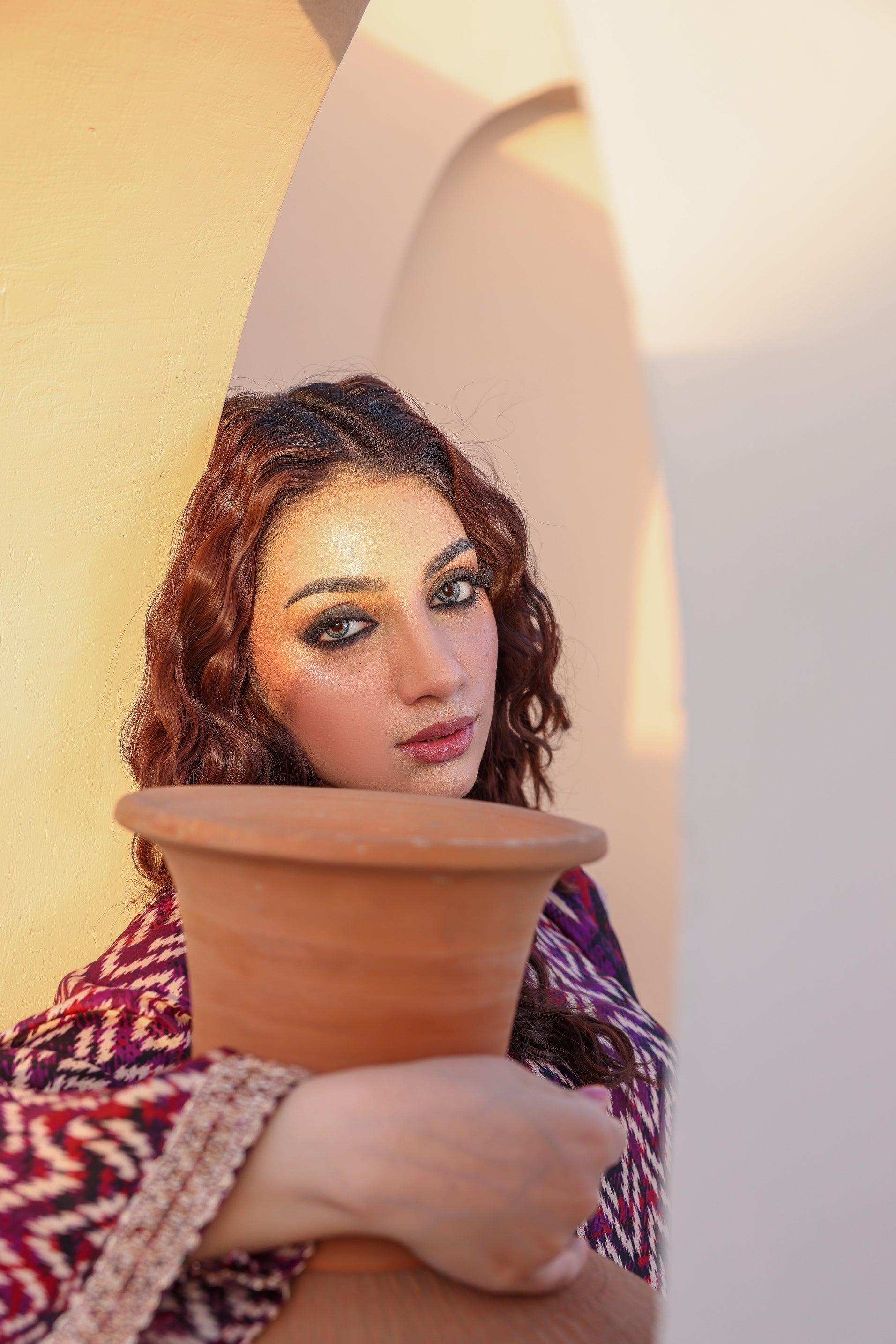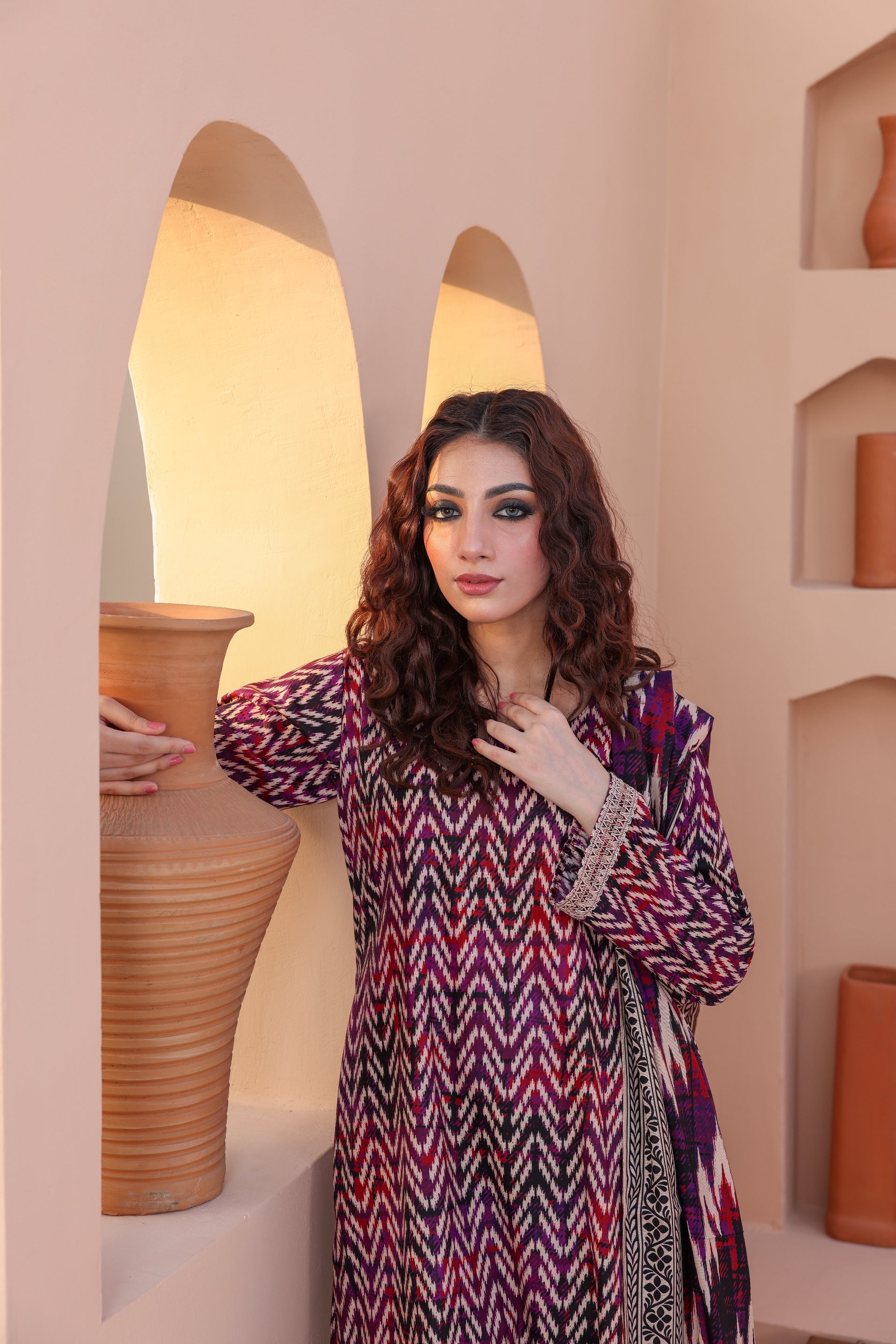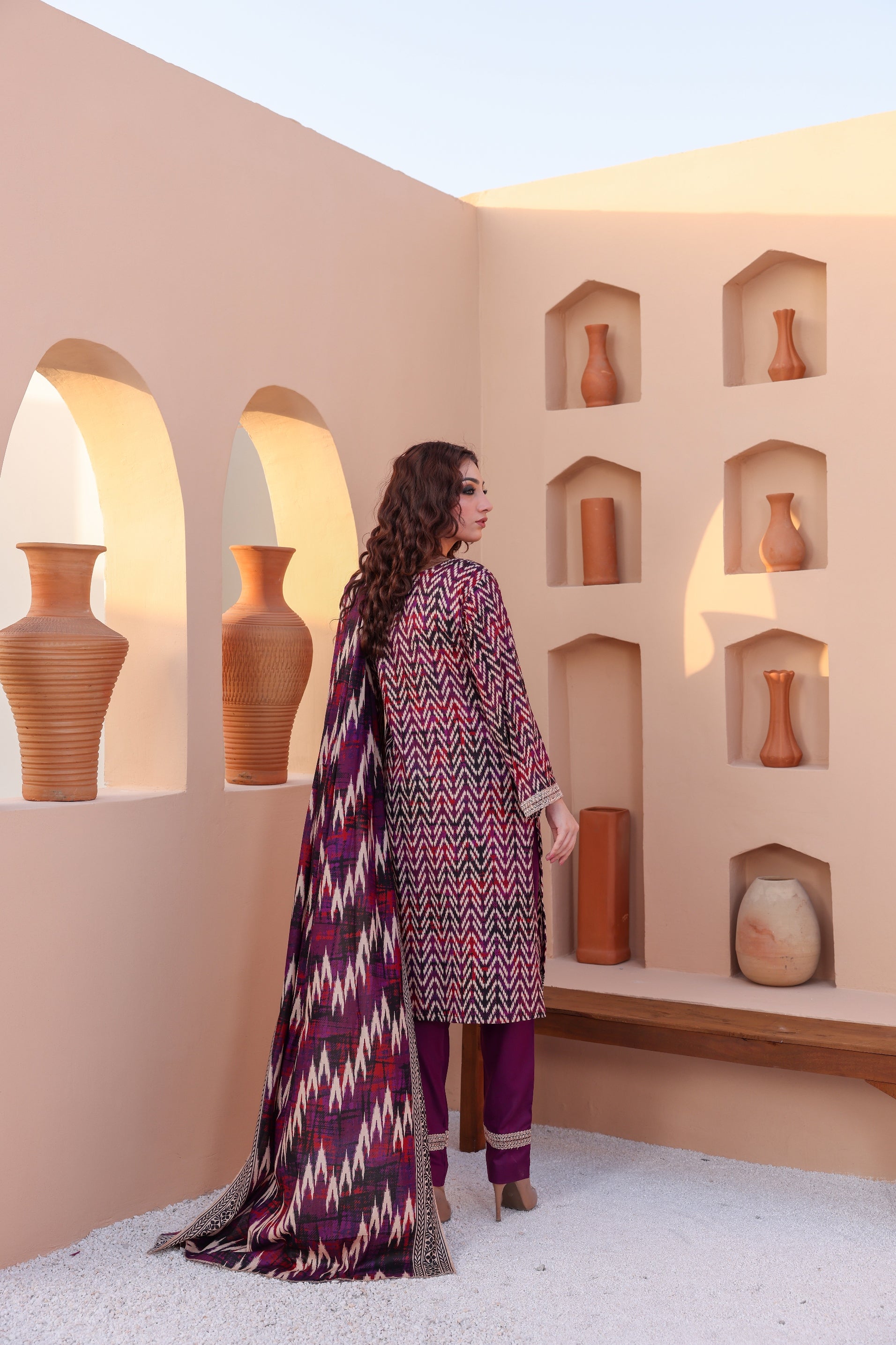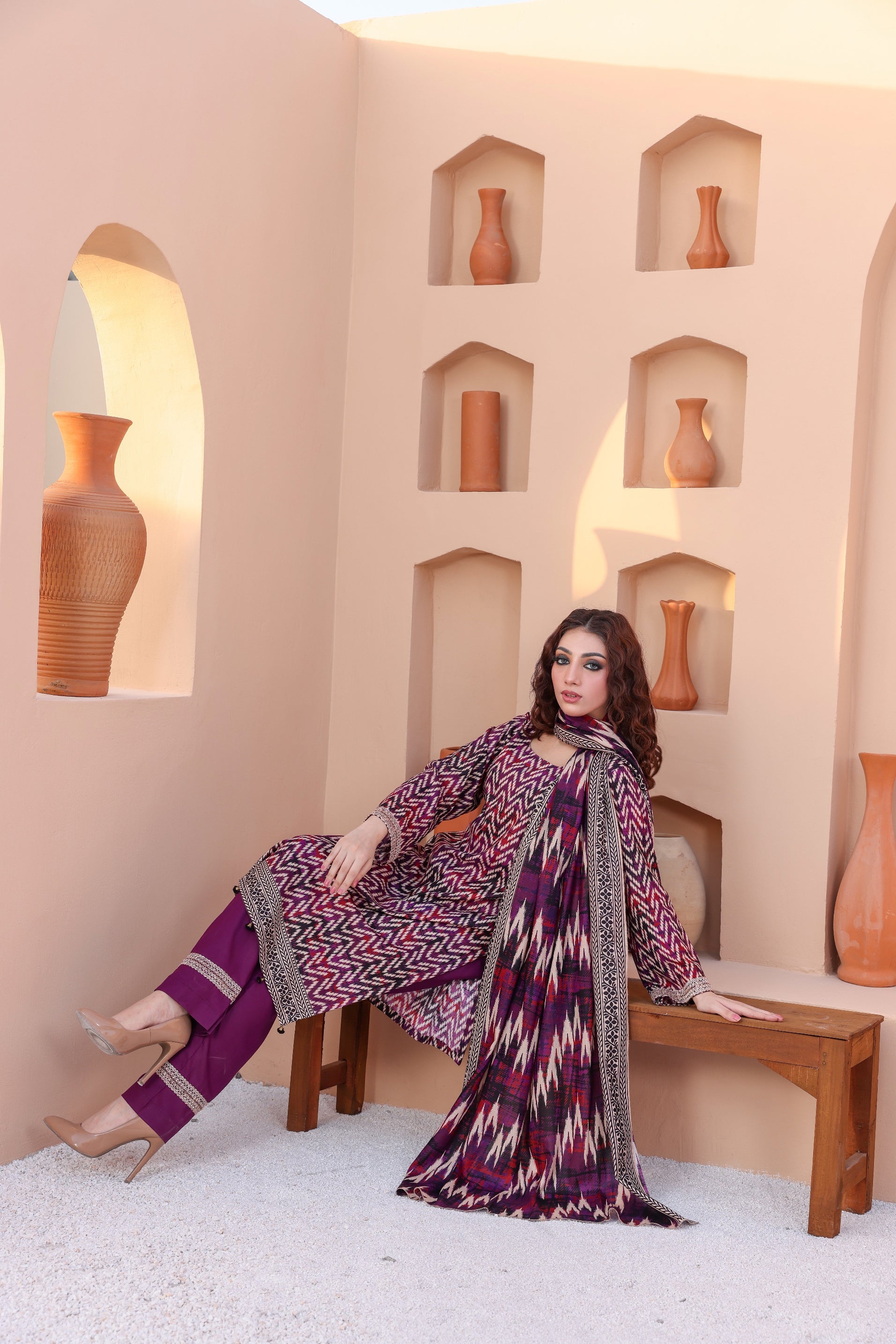 Experience modern elegance with this unstitched 3-piece suit in premium staple fabric, adorned with digital prints and chamki details – perfect for a graceful everyday look.