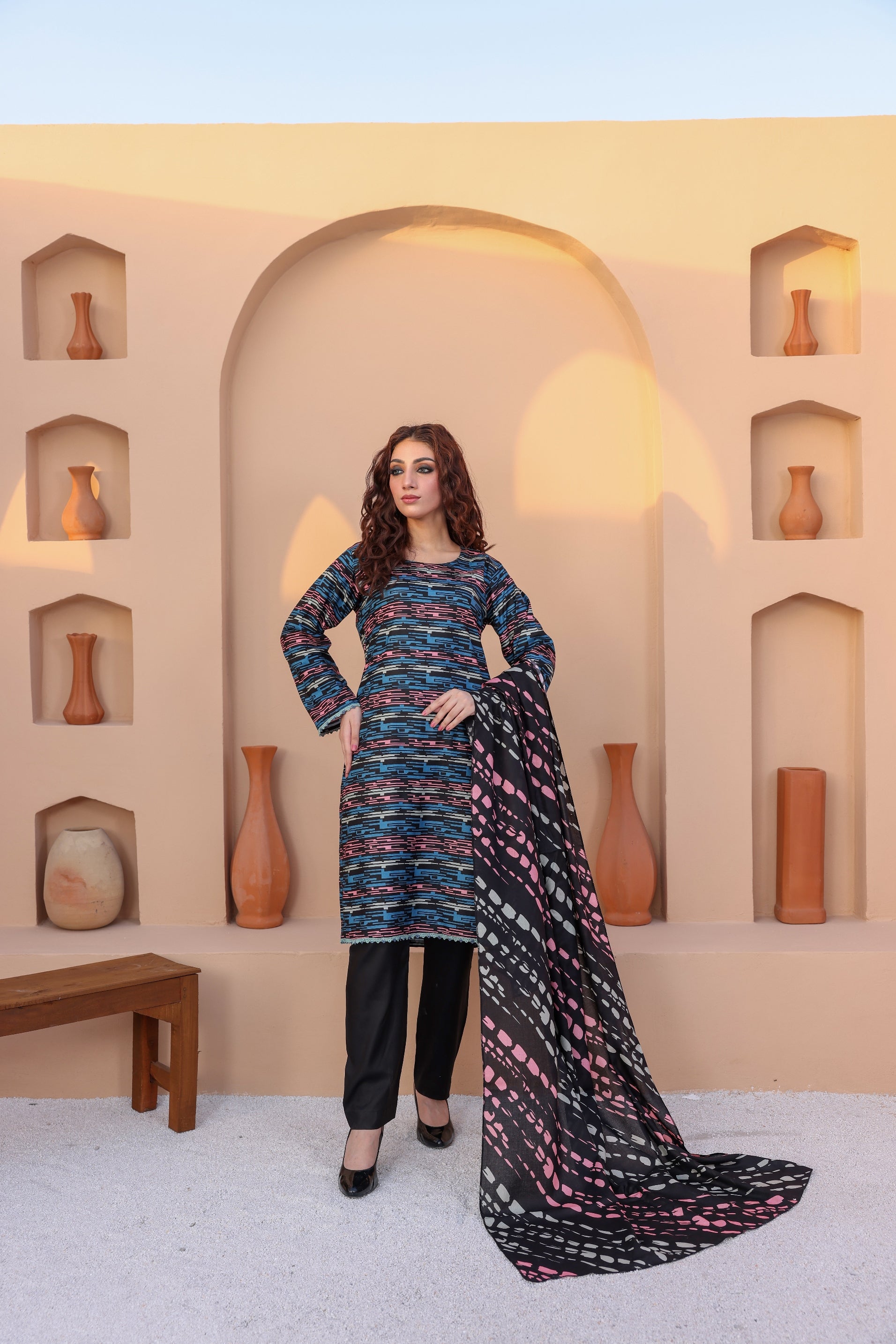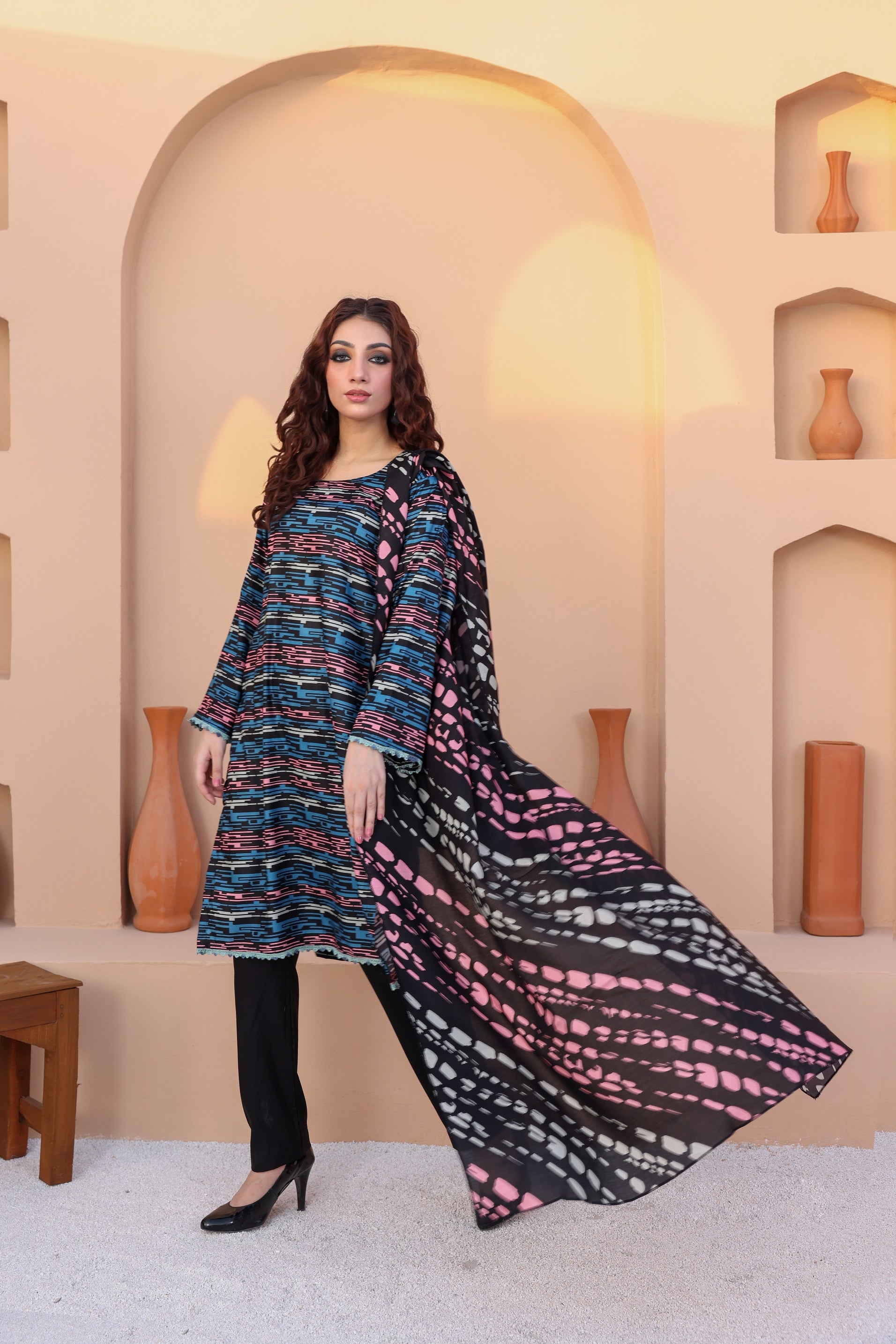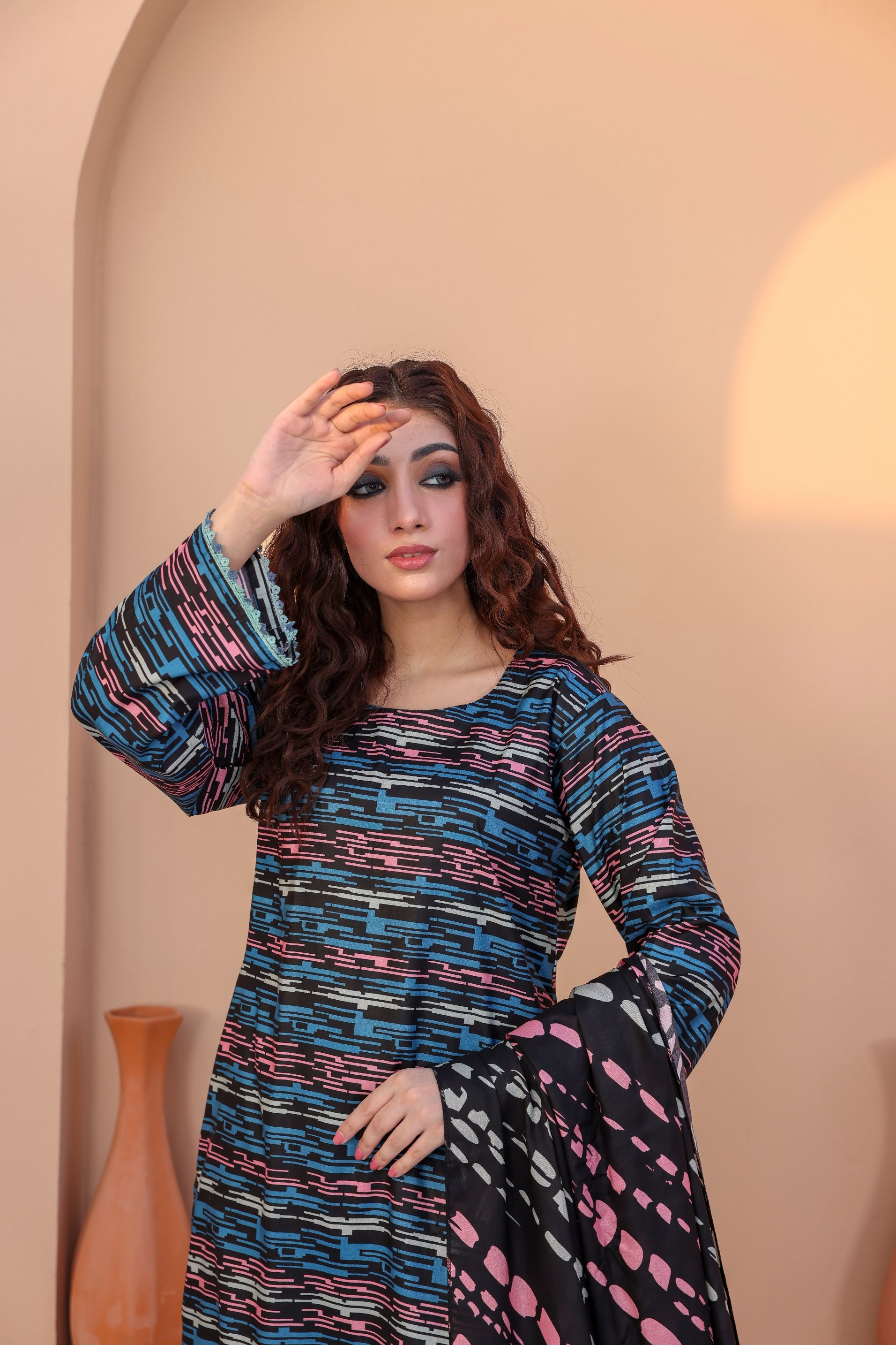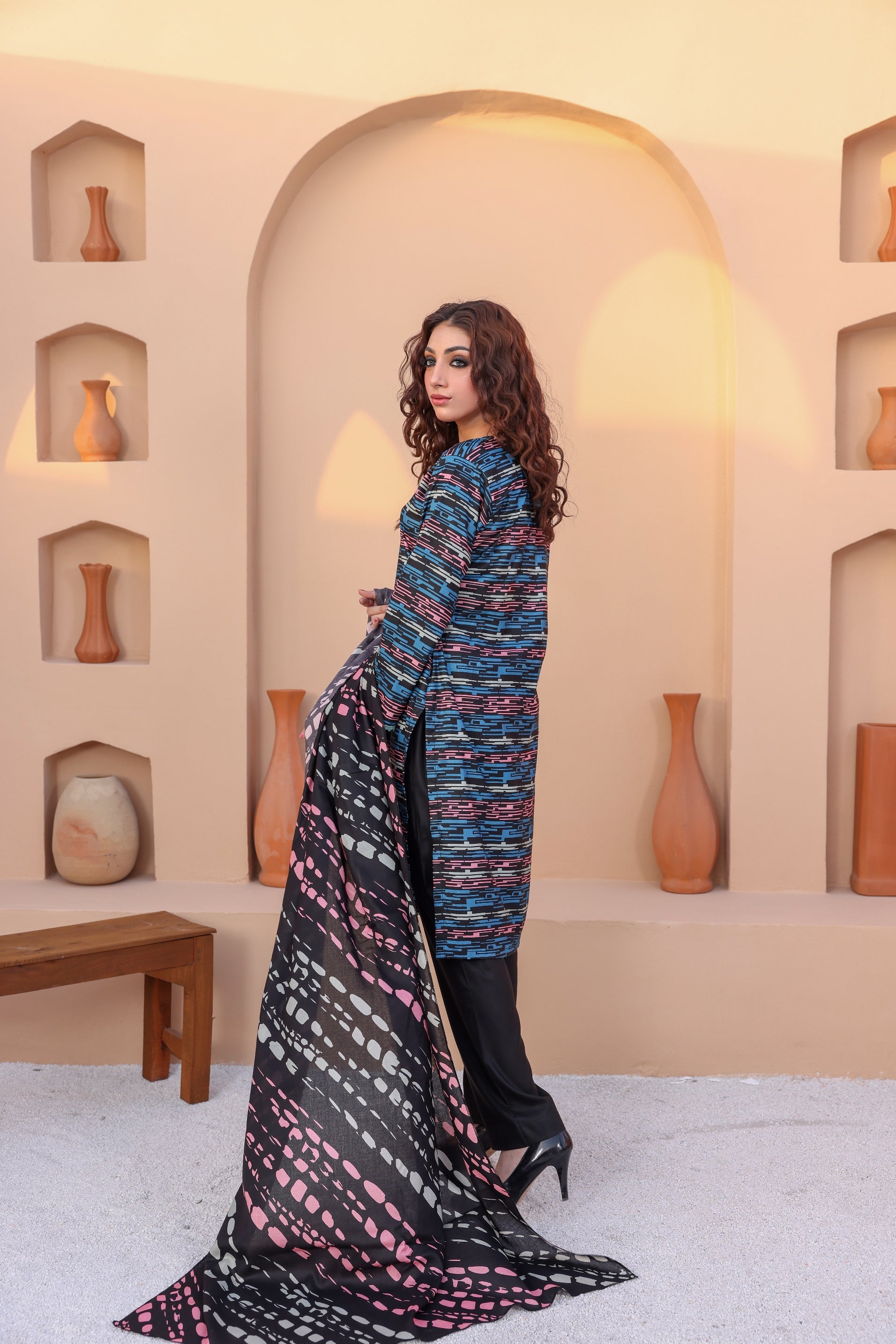 Experience modern elegance with this unstitched 3-piece suit in premium staple fabric, adorned with digital prints and chamki details – perfect for a graceful everyday look.